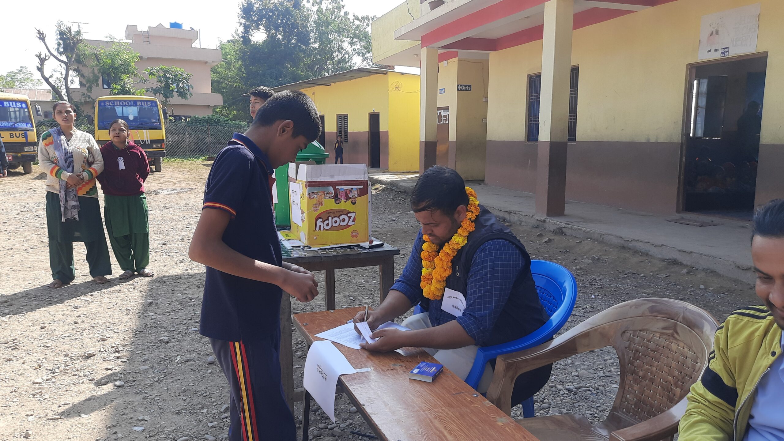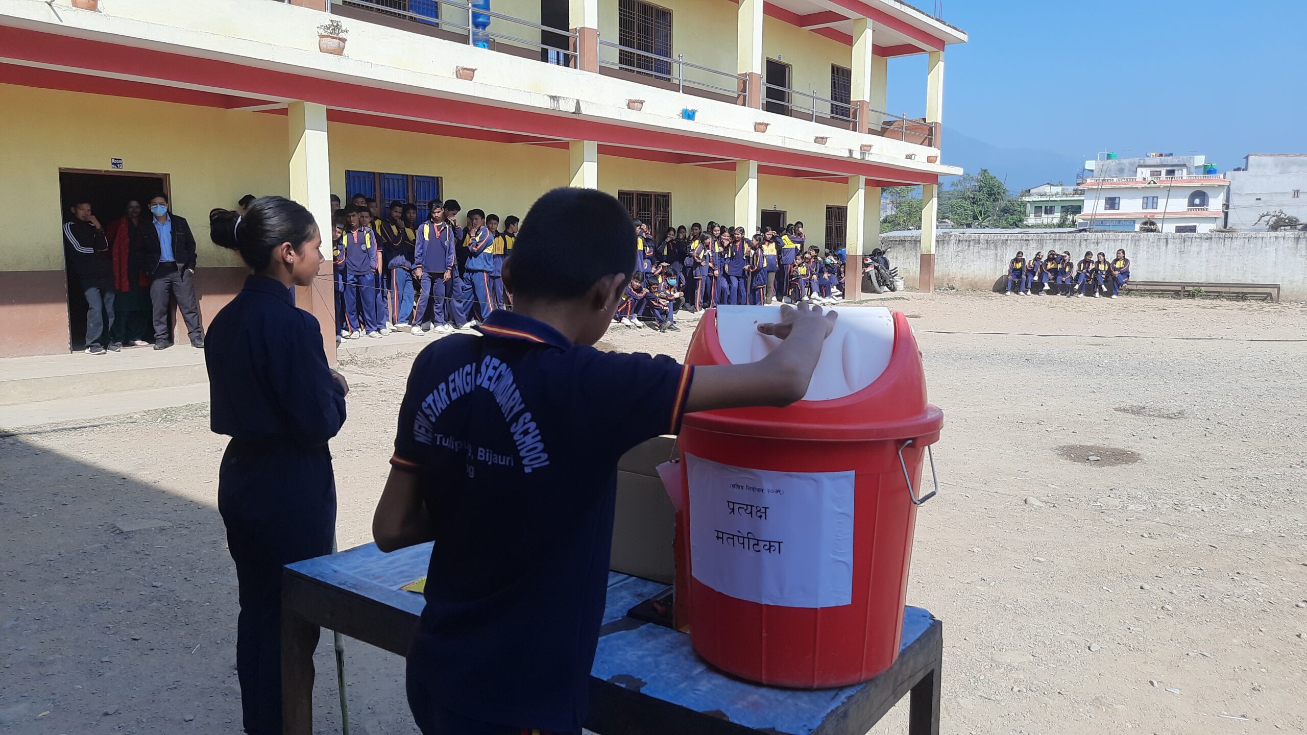 मंगलबार विहान ११ साढे ११ बजेको थियो । विद्यालयका प्रिन्सीपलले सम्पूर्ण मतदाताहरुलाई लाईनमा आउन आग्रह गरे । विद्यार्थीहरु सबै मतदाताको लाईनमा आए । एकतिर छात्राहरु र अर्को तिर छात्रहरु मतदानकालागि लाईनमा बसे । आम निर्वाचनमा मतदान स्थल जसरी ब्यबस्थापन गरिएको हुन्छ, त्यसरी नै ब्यबस्थापन गरियो । मतदान स्थलको सुरक्षाकालागि प्रहरी र म्यादी प्रहरी खटिएका थिए, भने मतदान अधिकृतसहित अन्य कर्मचारी, पर्यवेक्षेक र रिपोर्टिङकालागि पत्रकारहरु पनि थिए ।