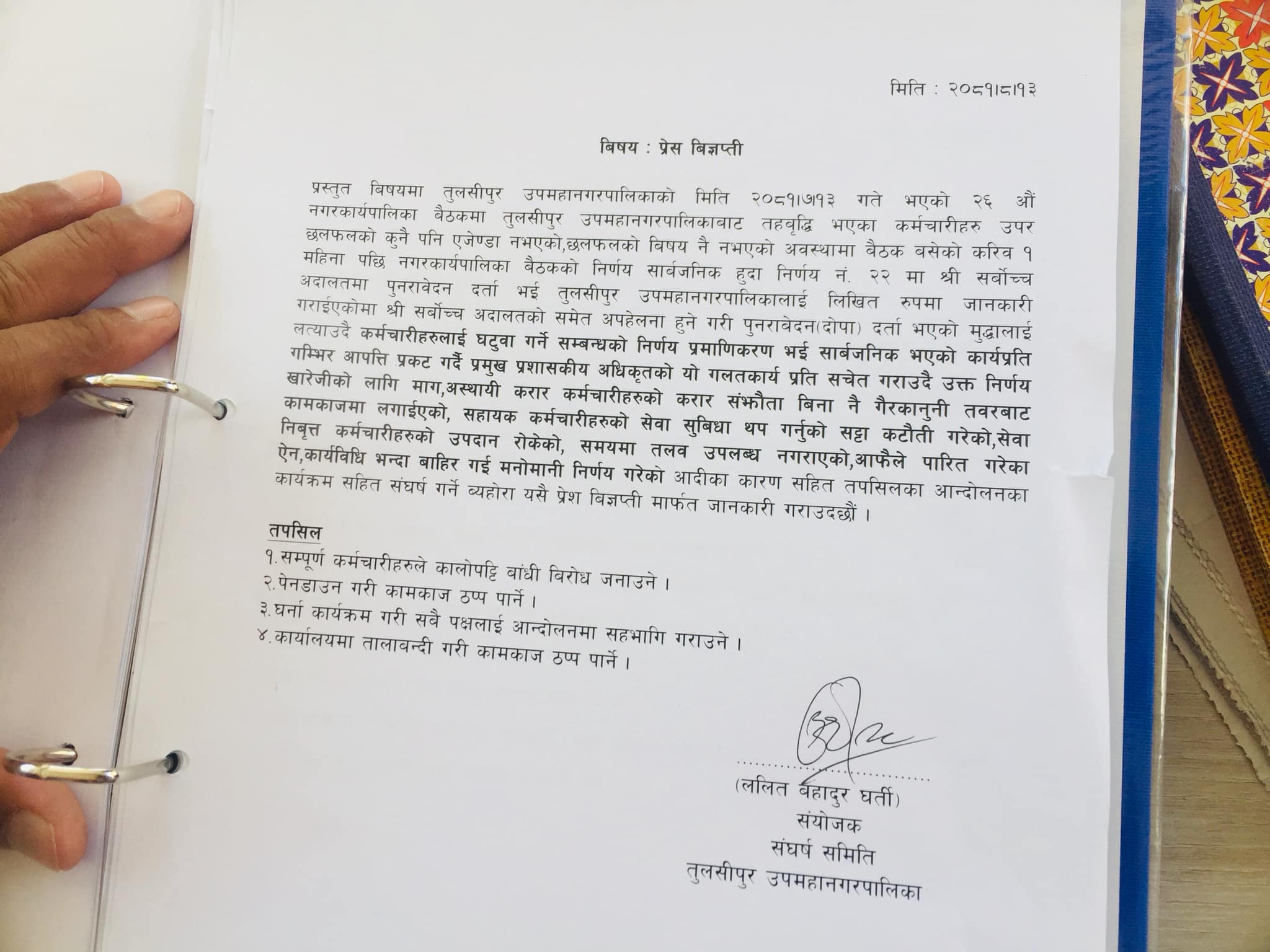 तुलसीपुर उपमहानगरपलिको स्थानीय तहका कर्मचारीको तह वृद्धि सम्बन्धी कार्यविधि २०७८ बमोजिम तह वृद्धि भएका स्थानीय तहका कर्मचारी बिभिन्न माग राख्दै आन्दोलनमा उत्रिएपछी उपमहानगरमा काम प्रभावित भएको हो ।