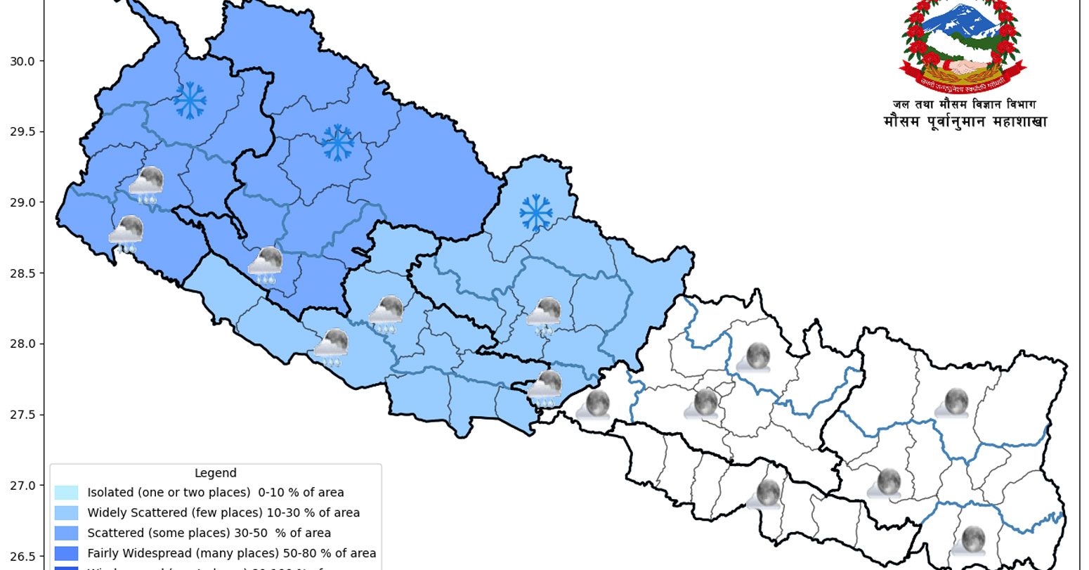 महाशाखाका मौसमविद् रोजन लामिछानेका अनुसार पश्चिमी न्यून चापीय प्रणालीका कारण सोमबार राति र मंगलबार सुदूरपश्चिम, कर्णाली, लुम्बिनी र गण्डकीका केही तथा बागमतीका पहाडी क्षेत्रमा वर्षाको सम्भावना छ। यी प्रदेशका उच्च पहाडी र हिमाली क्षेत्रमा हिमपातको पनि आकलन गरिएको छ। त्यसबाहेक कोशी र मधेश प्रदेशका एक–दुई स्थानमा वर्षा हुने देखिन्छ।