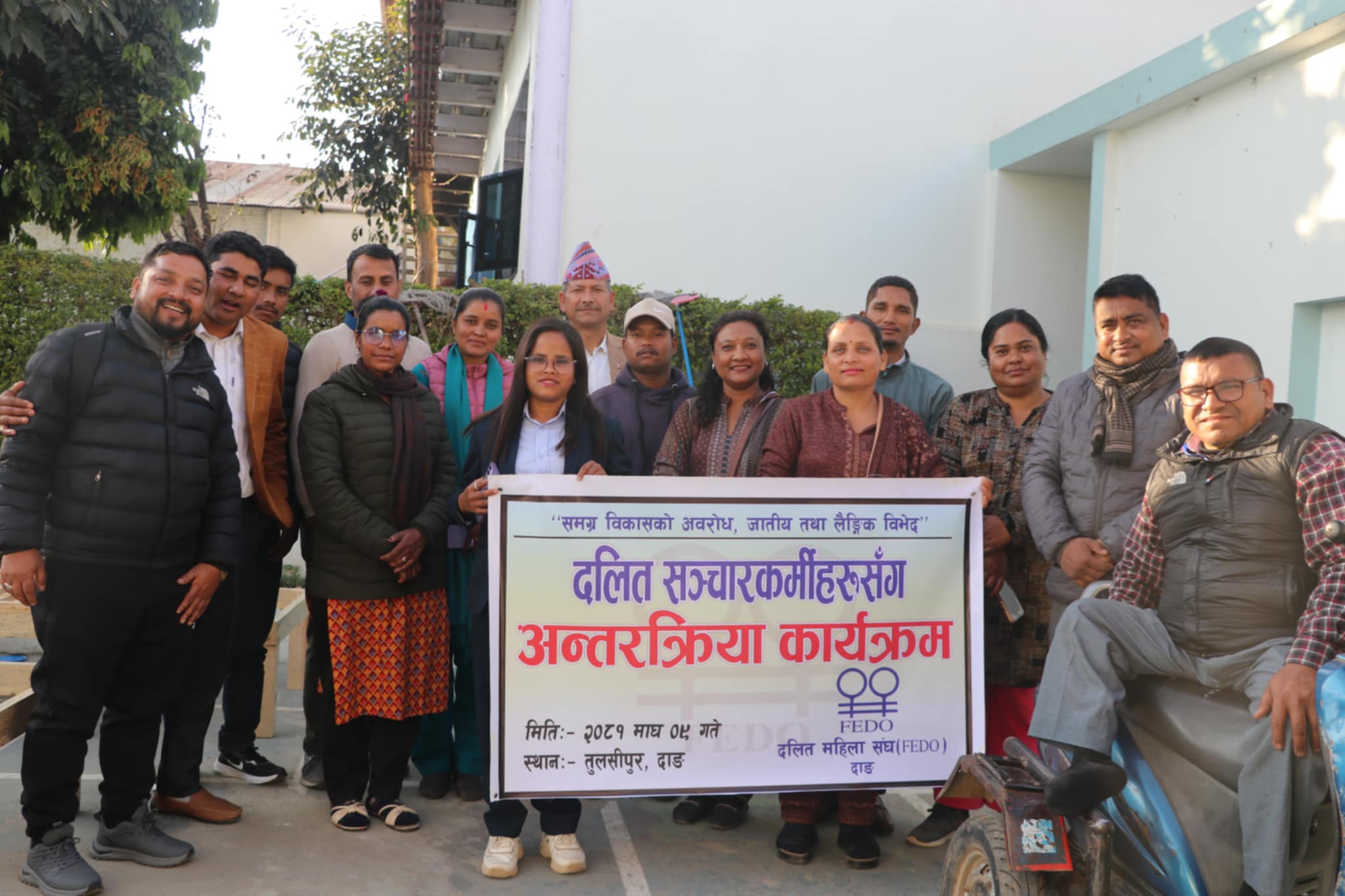 दलित महिला संघ फेडोको आयोजनामा बुधबार दलित सञ्चारकर्मीहरुसंग अन्तरक्रिया कार्यक्रम तुलसीपुरमा सम्पन्न भएको छ । दलित महिला संघ दाङका अध्यक्ष यूवा कराराको अध्यक्षता तथा राष्ट्रिय दलित आयोगका अध्यक्ष देवराज विश्वकर्माको प्रमुख आतिथ्यतामा कार्यक्रम भएको थियो ।