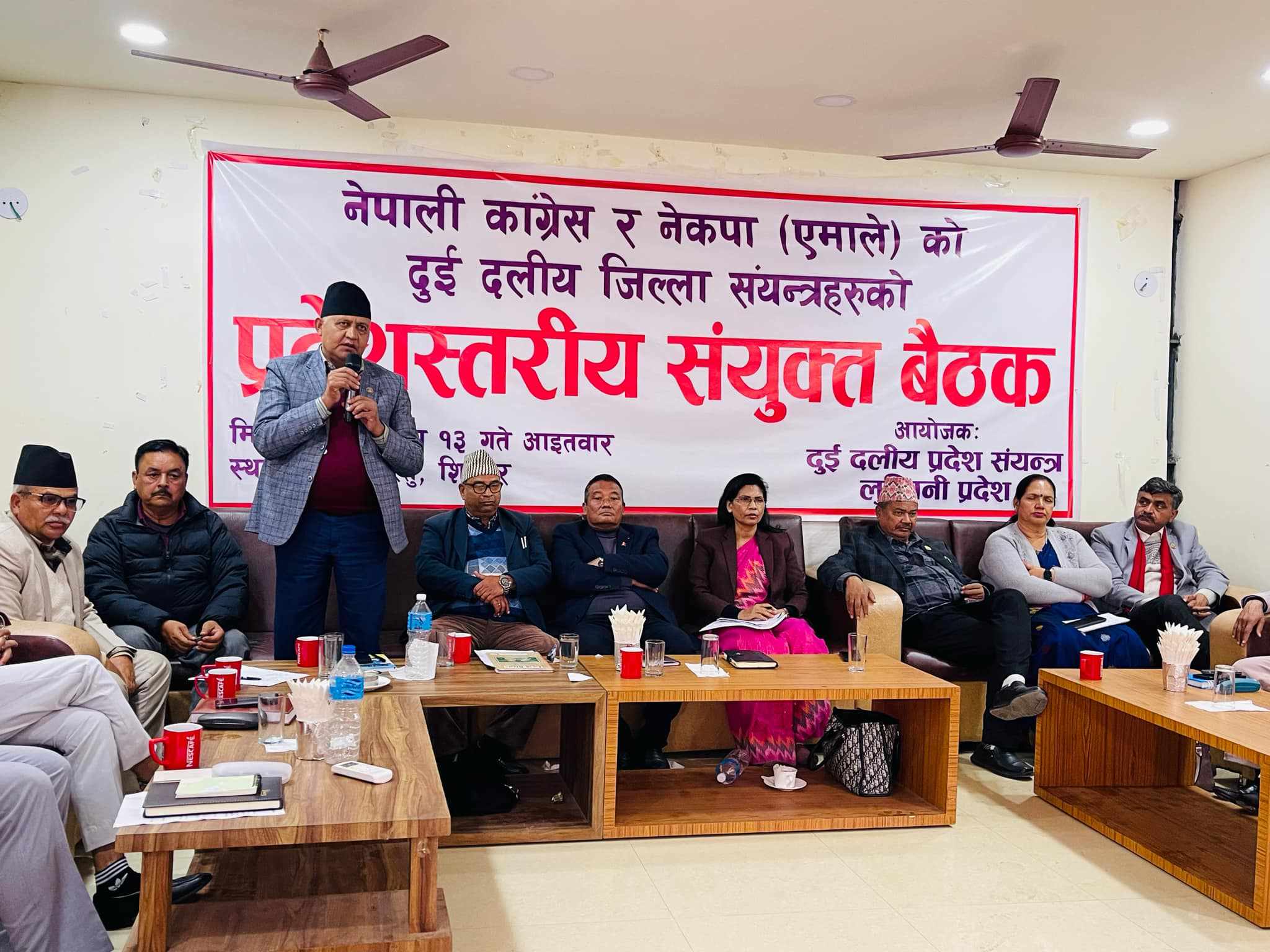 नेपाली कांग्रेस लुम्बिनी प्रदेशका सभापती अमरसिंह पुनको अध्यक्षता तथा नेकपा एमाले लुम्बिनी प्रदेशका ईञ्चार्ज पद्मा अर्यालको प्रमुख आतिथ्यतामा सम्पन्न बैठकमा नेपाली कांग्रेस र नेकपा एमालेका जिल्ला अध्यक्षहरुले जिल्लाग रिपोर्टीङ्ग गरेका थिए । बैठकमा लुम्बिनी प्रदेशका पूर्व मुख्यमन्त्री डिल्लीबहादुर चौधरी, एमाले लुम्बिनी प्रदेशका अध्यक्ष राधाकृष्ण कँडेल, प्रदेश सरकारका अन्य मन्त्री, प्रतिनिधि सभा सदस्यहरु लगायतको सहभागिता थियो ।