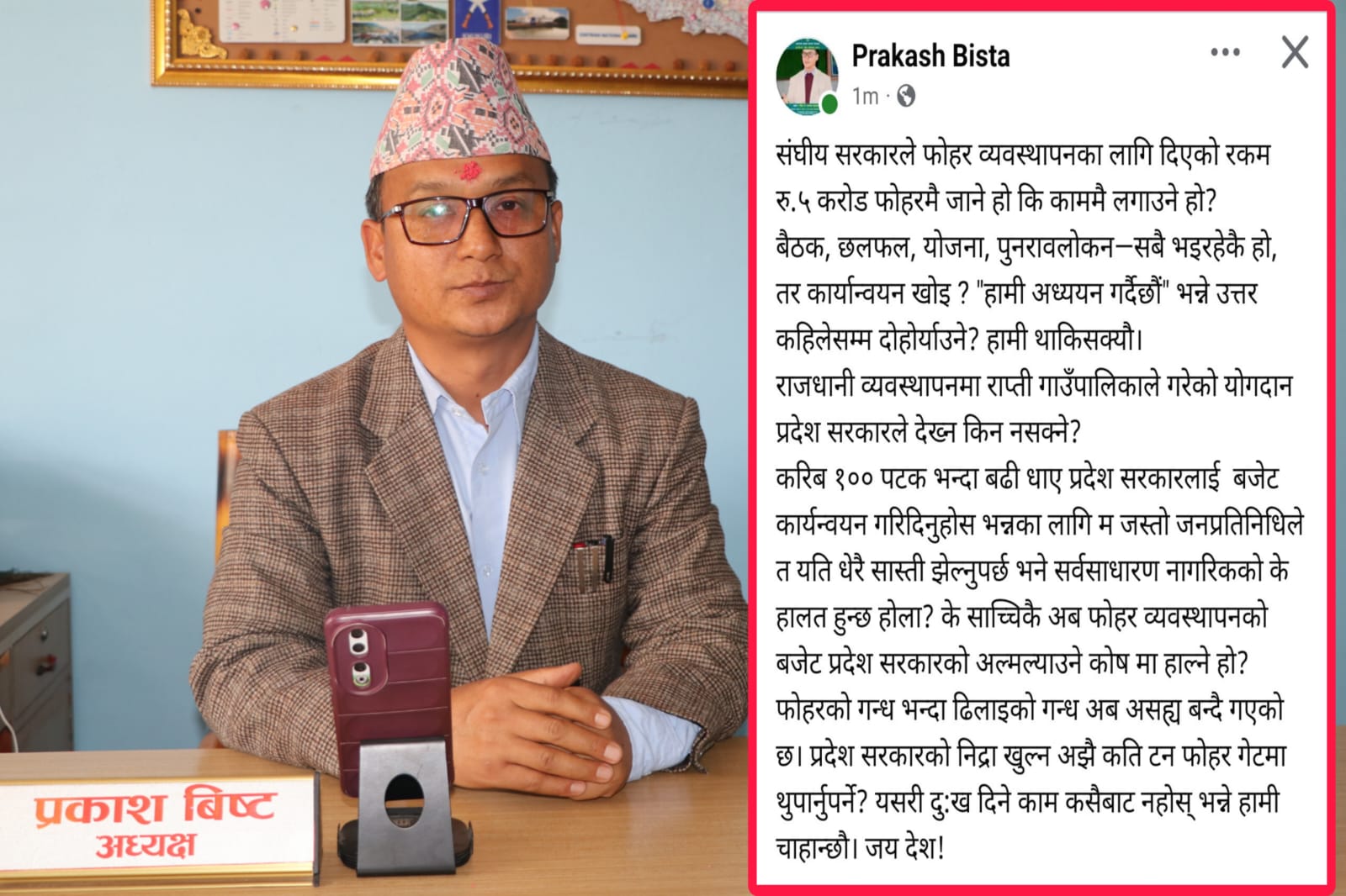 संघीय सरकारले फोहर व्यवस्थापनका लागि दिएको ५ करोड रुपैयाँ कार्यान्वयन नहुँदा राप्ती गाउँपालिकाका अध्यक्ष प्रकाश विष्टले गम्भीर असन्तुष्टि व्यक्त गर्नुभएको छ। उहाँले प्रदेश सरकारलाई बारम्बार आग्रह गर्दा पनि कुनै ठोस कदम नचालिएको भन्दै सामाजिक सञ्जालमार्फत कडा टिप्पणी गर्नुभएको छ।