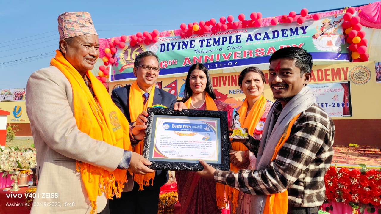 दाङको तुलसीपुर उपमहानगरपालिका वडा नं. ६ स्थित डिभाईन एजुकेशन फाउन्डेशनद्वारा सञ्चालित डिभाइन टेम्पल एमाडेमीले १६ औं स्थापना दिवको अवसरमा सम्मान गरेको हो ।
