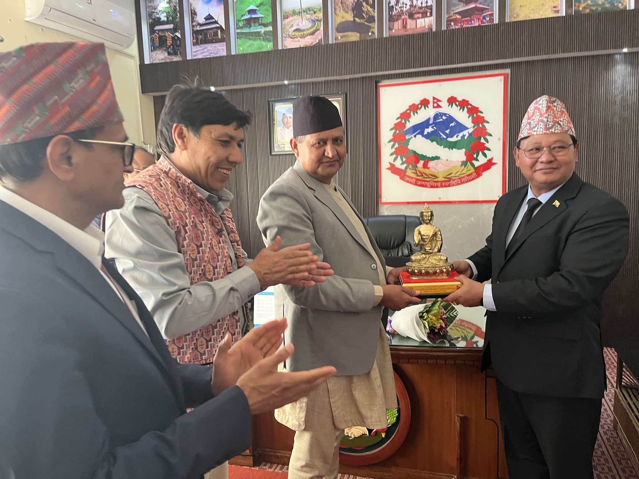 नेपालका लागि म्यान्मारका राजदूत उ म्यो म्यिन्ट माउङले बुधबार लुम्बिनी प्रदेशका मुख्यमन्त्री चेतनारायण आचार्यसँग शिष्टाचार भेट गर्नुभएको छ । मुख्यमन्त्री तथा मन्त्रिपरिषद्को कार्यालय, राप्ती उपत्यका (देउखुरी)मा भएको भेटवार्तामा दुई देशबीचको सम्बन्धलाई थप प्रगाढ बनाउने, आपसी सहयोग आदानप्रदान गर्ने तथा सहकार्यलाई विस्तार गर्ने विषयमा छलफल भएको थियो ।