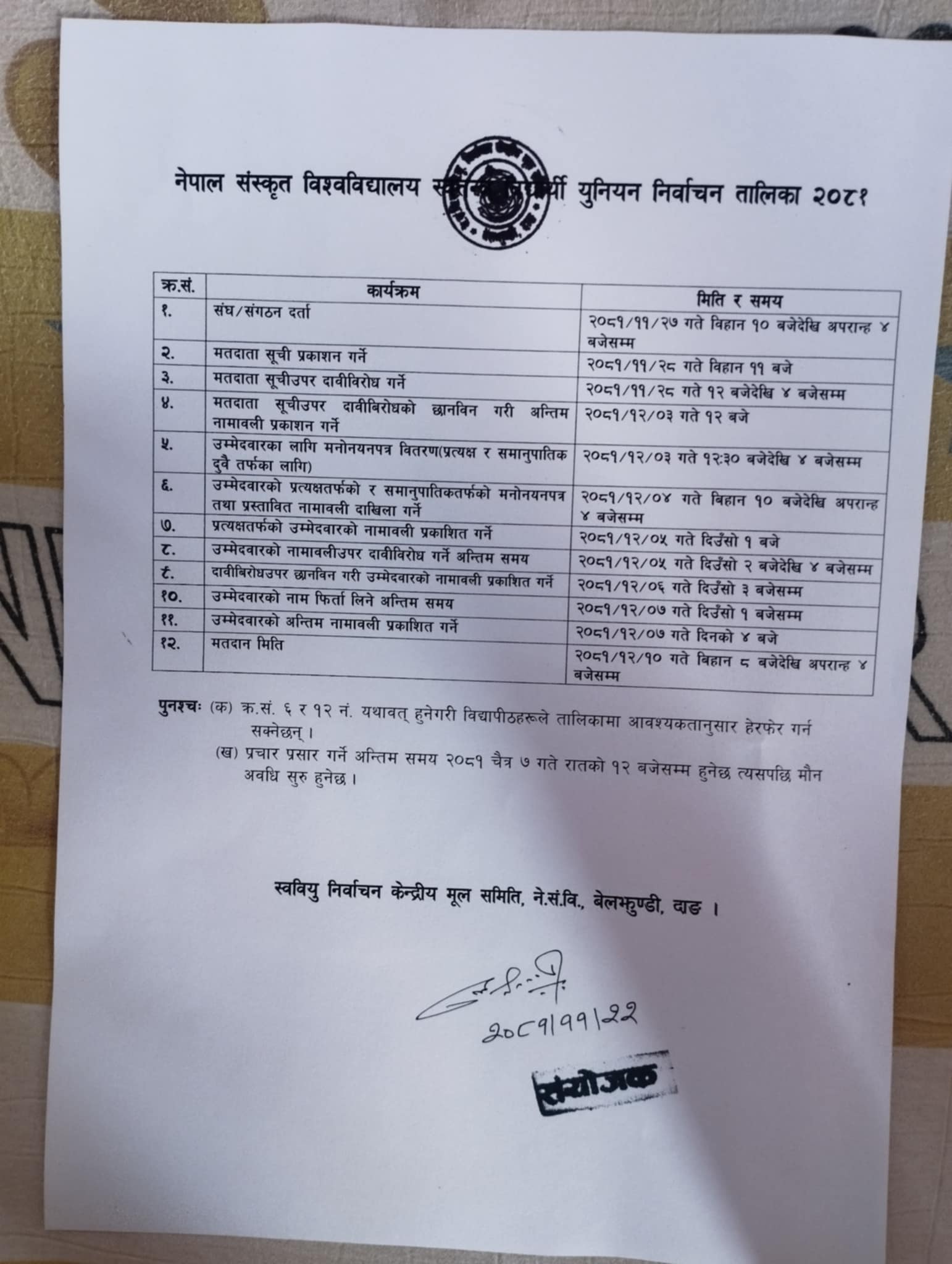 निर्वाचनकालागि २७ फागुनसम्म संगठन दर्ता, २८ गते मतदाता सूचि प्रकाशन,३ चैतमा उम्मेदवारी दर्ताको समय तोकिएको छ । ६ चैतसम्म उम्मेदवारी फिर्ता लिने समय तोकिएको छ, भने ७ गते उम्मेदावरको अन्तिम नामावली प्रकाशन गरिनेछ ।