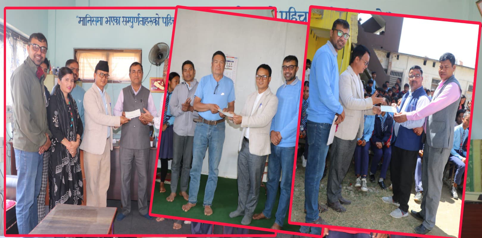 पालिकाका अध्यक्ष प्रकाश विष्टको रोहबरमा संस्थाका कार्यक्रम अधिकृत हेमराज शर्मा र विद्यार्थी संयोजक दीपा चौधरीले सम्बन्धित विद्यालयका प्रधानाध्यापक र विद्यालय व्यवस्था समितिका अध्यक्षलाई चेक हस्तान्तरण गर्नुभयो।