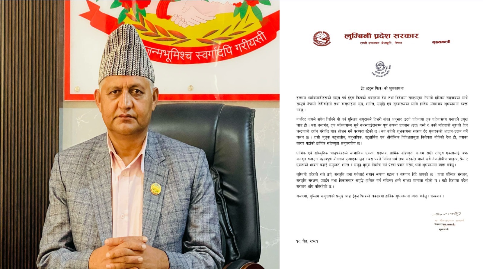 दाङ, १८ चैत । लुम्बिनी प्रदेशका मुख्यमन्त्री चेतनारायण आचार्यले इस्लाम धर्मावलम्बीहरूको महान् पर्व ईद उल फित्रको अवसरमा शुभकामना व्यक्त गर्नुभएको छ । उहाँले देश तथा विदेशमा रहेका नेपाली मुस्लिम समुदायका साथै सम्पूर्ण नेपाली दिदीबहिनी तथा दाजुभाइमा सुख, शान्ति, समृद्धि र सुस्वास्थ्यको कामना गर्नुभएको हो ।