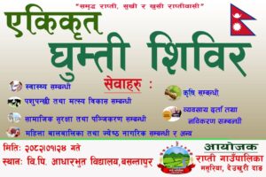 दाङको राप्ती गाउँपालिकाले बैशाख २४ गते अर्थात भोलि बुधबार वडा नम्बर ३ स्थित बसन्तापुरमा एकदिने एकीकृत घुम्ती सेवा शिविर सञ्चालन गर्ने भएको छ।