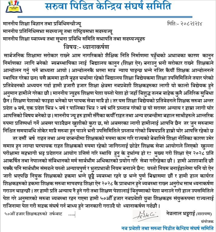 समितिका संयोजक नेत्रलाल भट्टराई(नारायण)ले ध्यानाकर्षण पत्र लेख्दै शिक्षक सरुवा अन्तरप्रदेश ७ बर्ष, एक प्रदेश भित्र ५ बर्ष र पालिका भित्र २ बर्ष भनि शिक्षा विद्येयकमा प्रस्ताब गरेको भन्दै यो मान्य नहुँने बताए ।