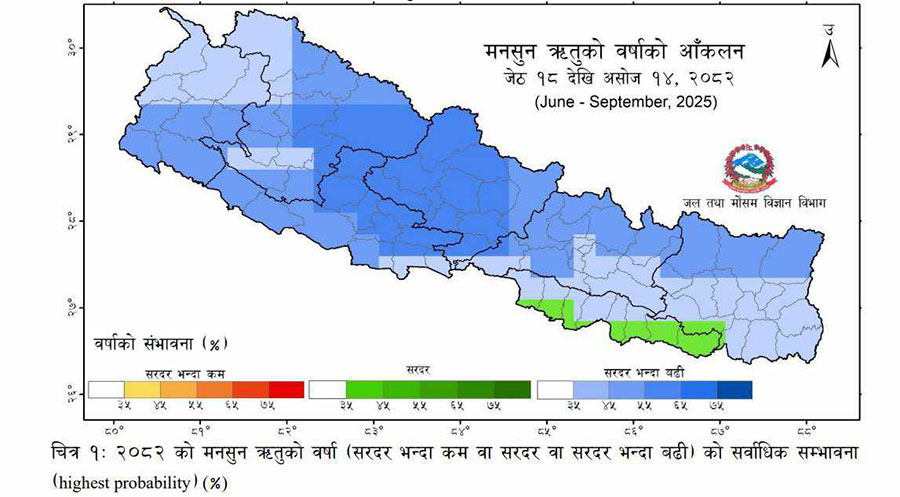 यसैगरी सुदूरपश्चिम प्रदेशको दक्षिणी भू–भाग, लुम्बिनी प्रदेशको पश्चिमी भू–भाग, गण्डकी प्रदेशको उत्तर–पूर्वी भू–भाग, बागमती र कोशी प्रदेशको उत्तरी भू–भागमा सरदरभन्दा बढी वर्षा हुने सम्भावना ४५ देखि ५५ प्रतिशत छ ।