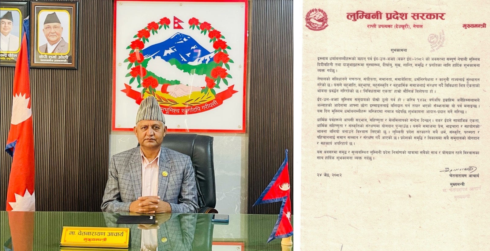 ईद–उल–अज्हाको यस अवसरमा समृद्ध र सुव्यवस्थित लुम्बिनी प्रदेश निर्माणको यात्रामा सबैको साथ र योगदान रहने विश्वास व्यक्त गर्नु भएको छ ।