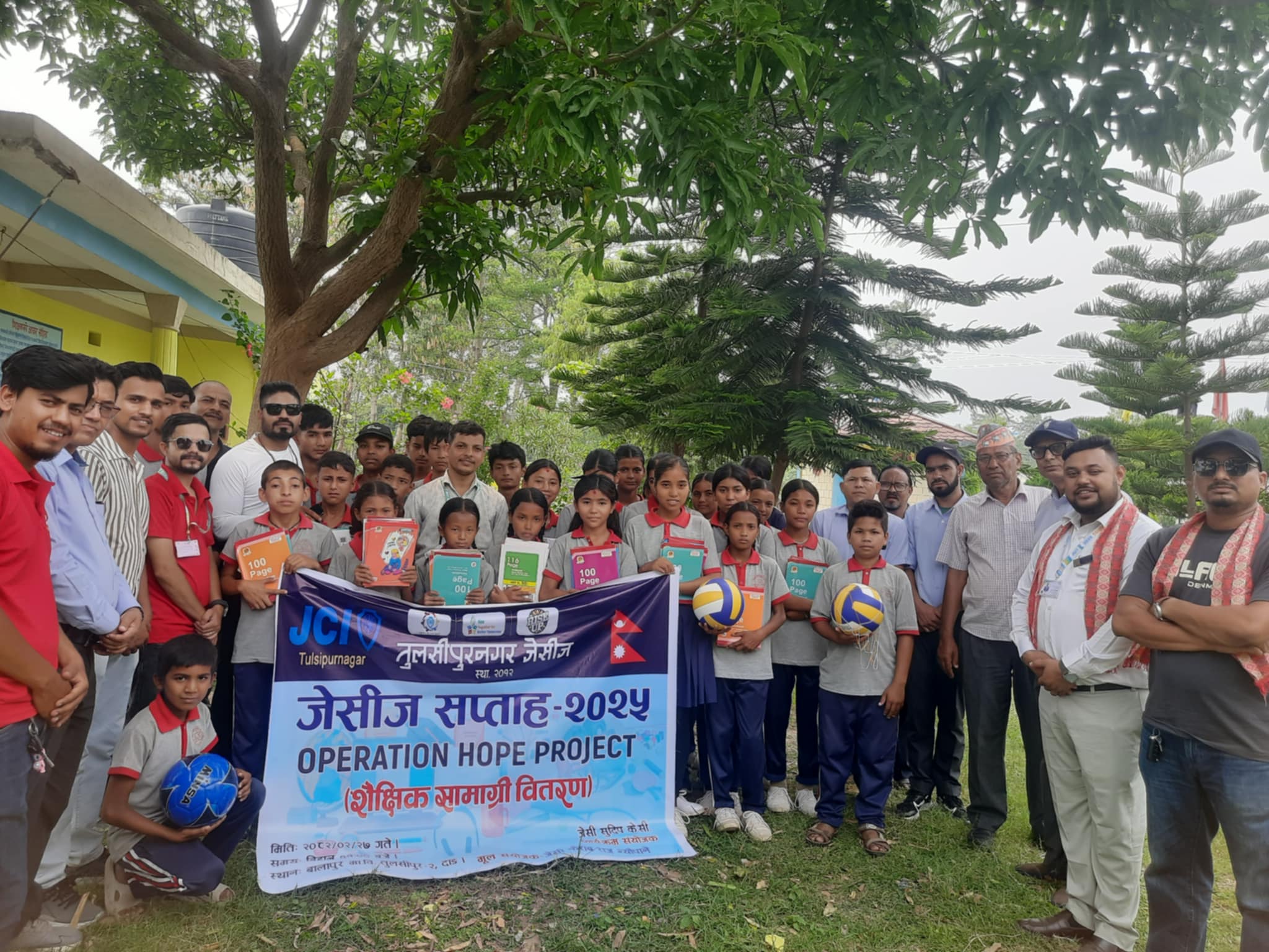 तुलसीपुर, २७ जेठ । तुलसीपुर नगर जेसिजले विपन्न बिद्यार्थीहरूलाइ शैक्षिक सामग्री सहयाेग गरेकाे छ । जेसिज सप्ताह अन्तर्गत मंगलबार तुलसीपुर २ स्थित बालापुर माबिमा अध्ययनरत विद्यार्थीहरूलाई कपी, ज्यामिती बक्स, भलिबललगायतका सामग्री वितरण गरिएकाे हाे ।