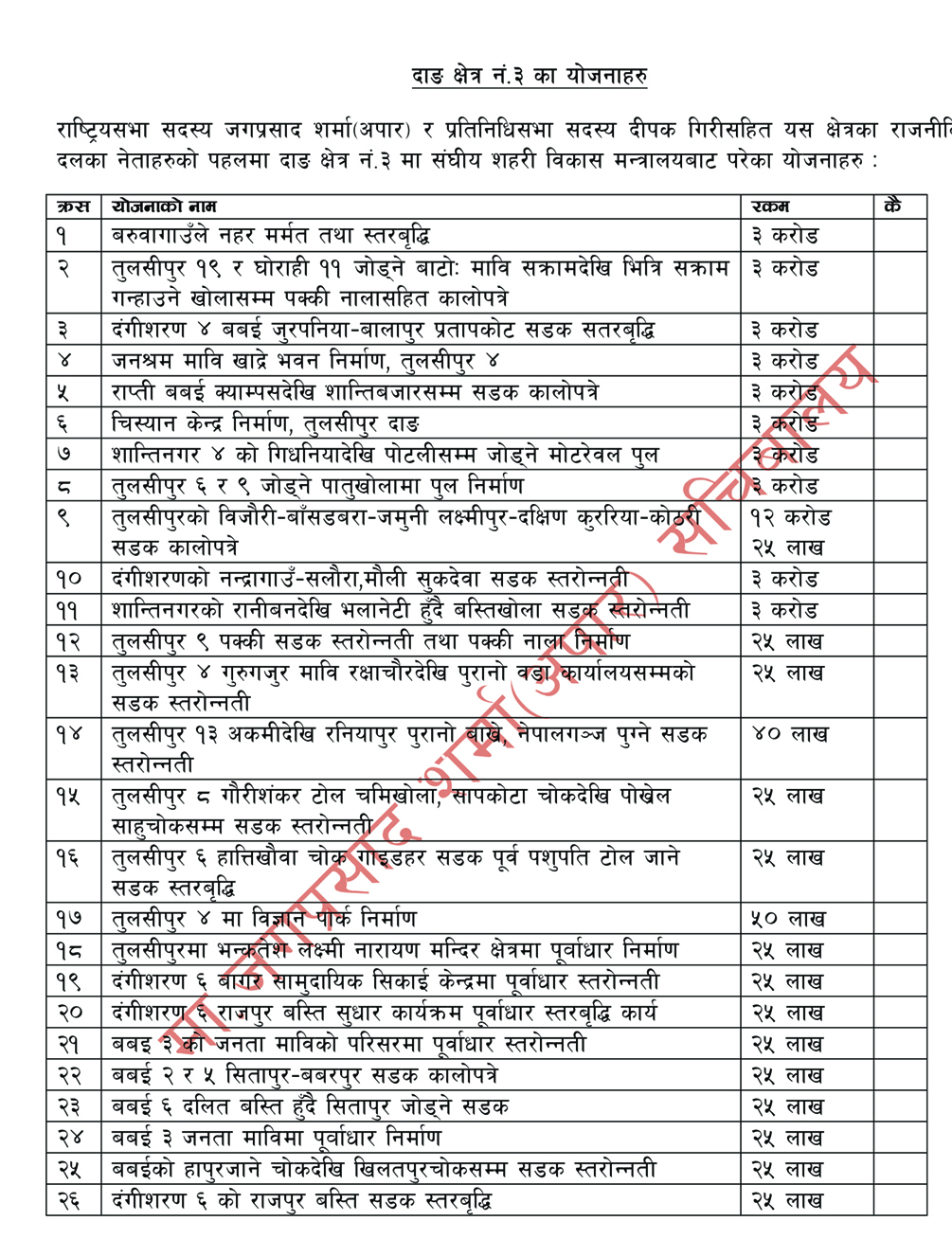 उनका अनुसार तुलसीपुरमा चिस्यान केन्द्र निर्माणकालागि ३ करोड बजेट परेको छ । त्यस्तै बरुवा गाउँले नहर मर्मत तथा स्तरबृद्धिकालागि ३ करोड, विज्ञान पार्क निर्माणकालागि ५० लाख बजेट छ ।