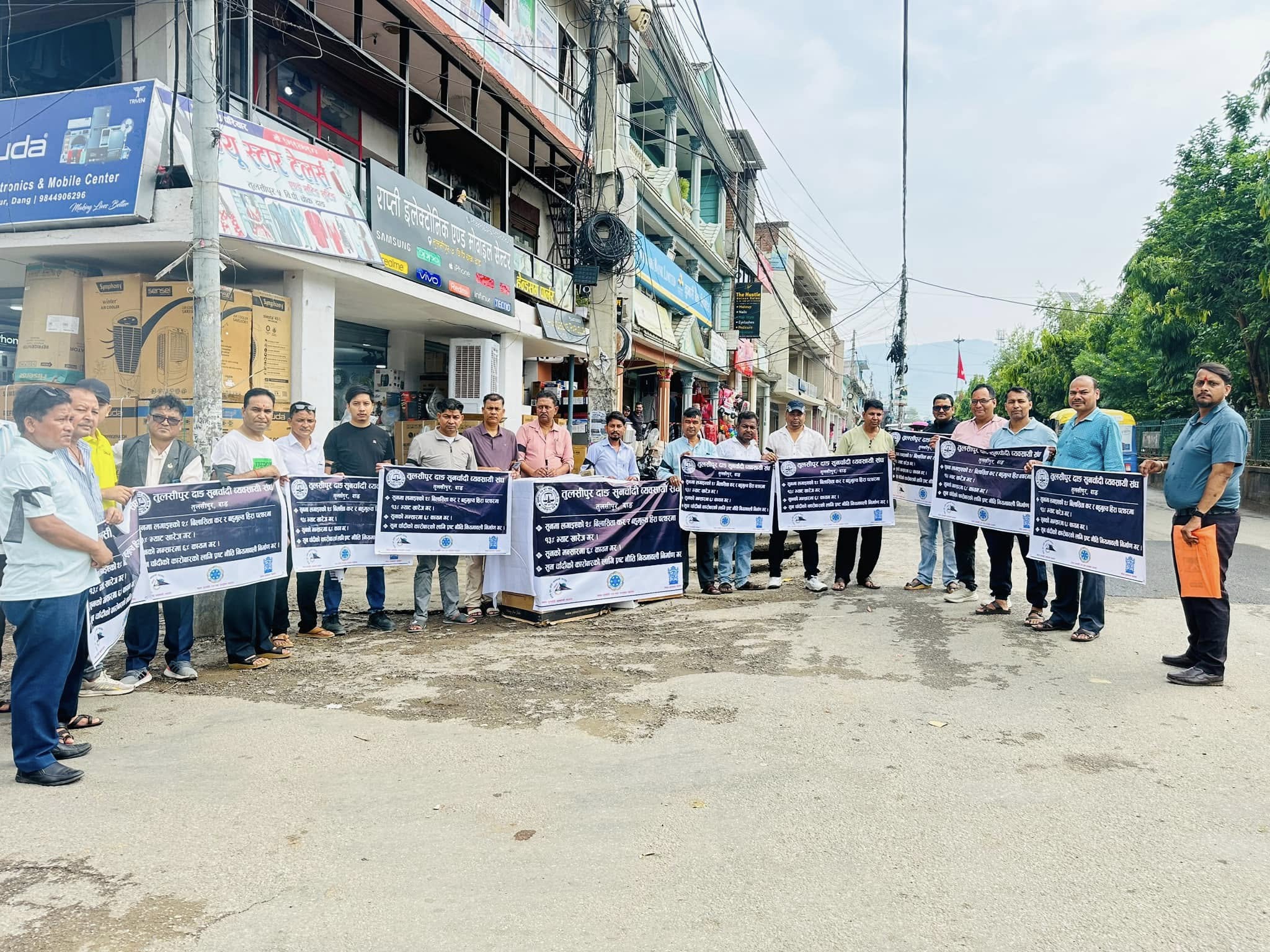 तुलसीपुर दाङ सुनचाँदी व्यवसायी संघ तुलसीपुरको आयोजनामा बुधवार विपिचोकमा हस्ताक्षर संकलन गरिएको महासचिव तुलसीराम सुनारले जानकारी दिनुभयो । उहाँका अनुसार संघका उपाध्यक्ष मनोज शाहको अध्यक्षतामा कार्यक्रम भएको हो । सो अवसरमा संघका सल्लाहकार मिनराज वली र निवर्तमान उपाध्यक्ष ईन्द्रविर डाँगीले सरकारले ल्याउन लागेको निति व्यवसायी र ग्राहकहरुको हित विपरित भएको भन्दै विरोध जनाउनु भएको छ । सरकारले यस बारेमा तत्कालै निति सच्याउनु पर्ने उनीहरुले माग गरेका छन् ।
