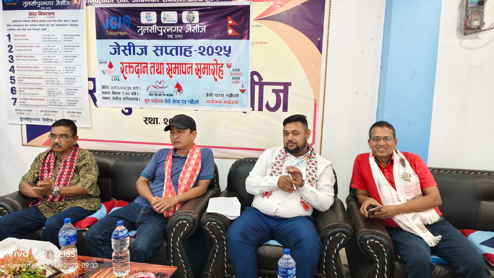 तुलसीपुर नगरजेसिजको सप्ताहको शनिबार समापन गरिएको छ । शनिबार अन्तिम दिन रक्तदान गरि सप्ताहको समापन गरिएको हो । अध्यक्ष सन्दीप भुसालको अध्यक्षता तथा तुलसीपुर उपमहानगरपालिका वडा नम्बर ५ का वडा अध्यक्ष वीरेन्द्रकुमार शाहको प्रमुख आतिथ्यतामा समापन कार्यक्रम भएको हो ।