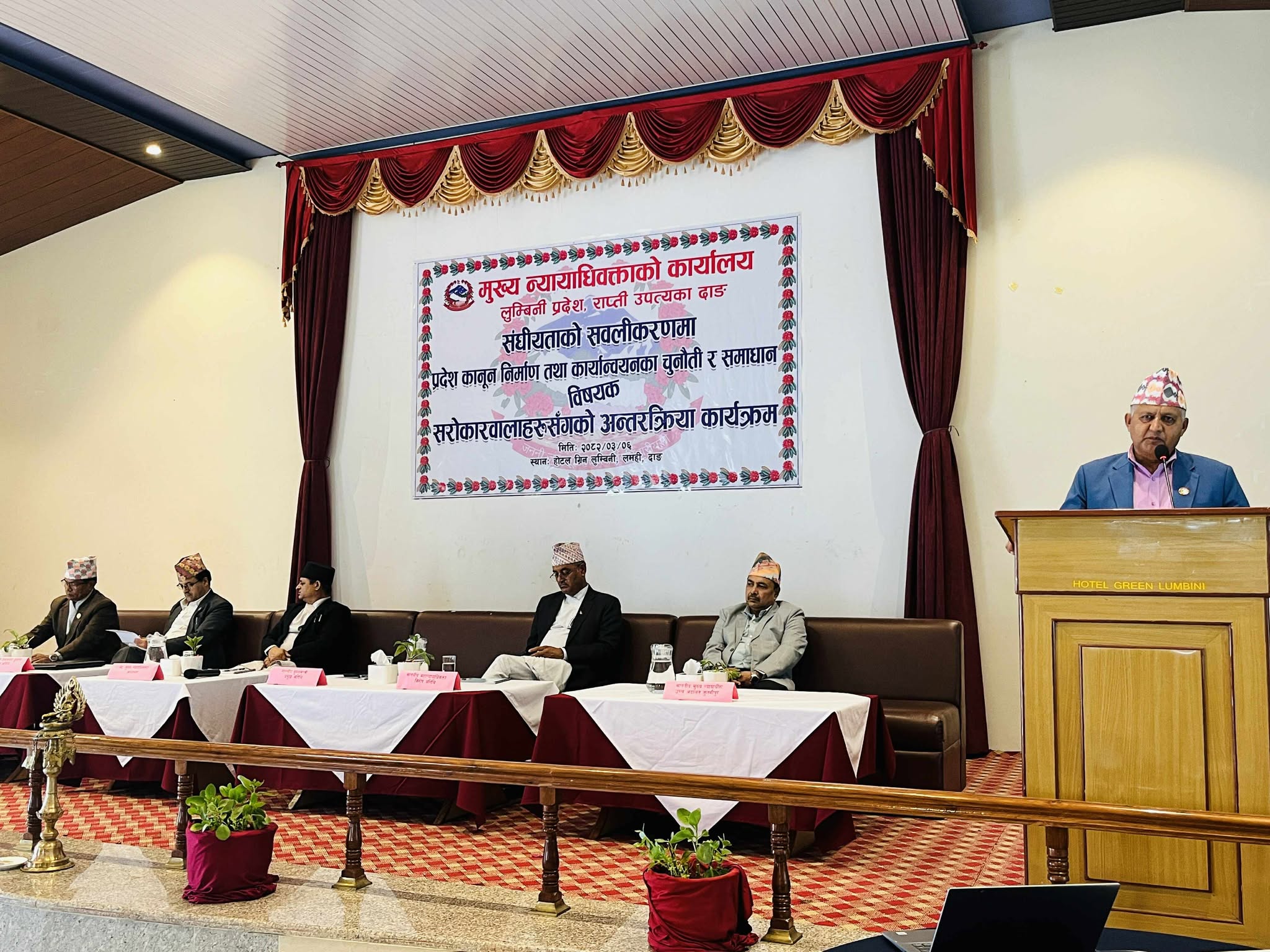 लुम्बिनी प्रदेशका मुख्य न्यायाधिवक्ता यमलाल खनालको अध्यक्षता तथा मुख्यमन्त्री चेतनारायण आचार्यको प्रमुख आतिथ्यतामा सम्पन्न उक्त कार्यक्रममा सर्वोच्च अदालतका न्यायाधीश टेकप्रसाद ढुंगाना, उच्च अदालतका मुख्य न्यायाधीश राजेश्वर तिवारी, प्रदेश सभा सदस्यहरू, न्यायालयका प्रतिनिधिहरू, नेपाल बार एशोसिएसनका पदाधिकारी लगायत सरोकारवाला पक्षहरूको उल्लेखनीय सहभागिता रहेको थियो ।