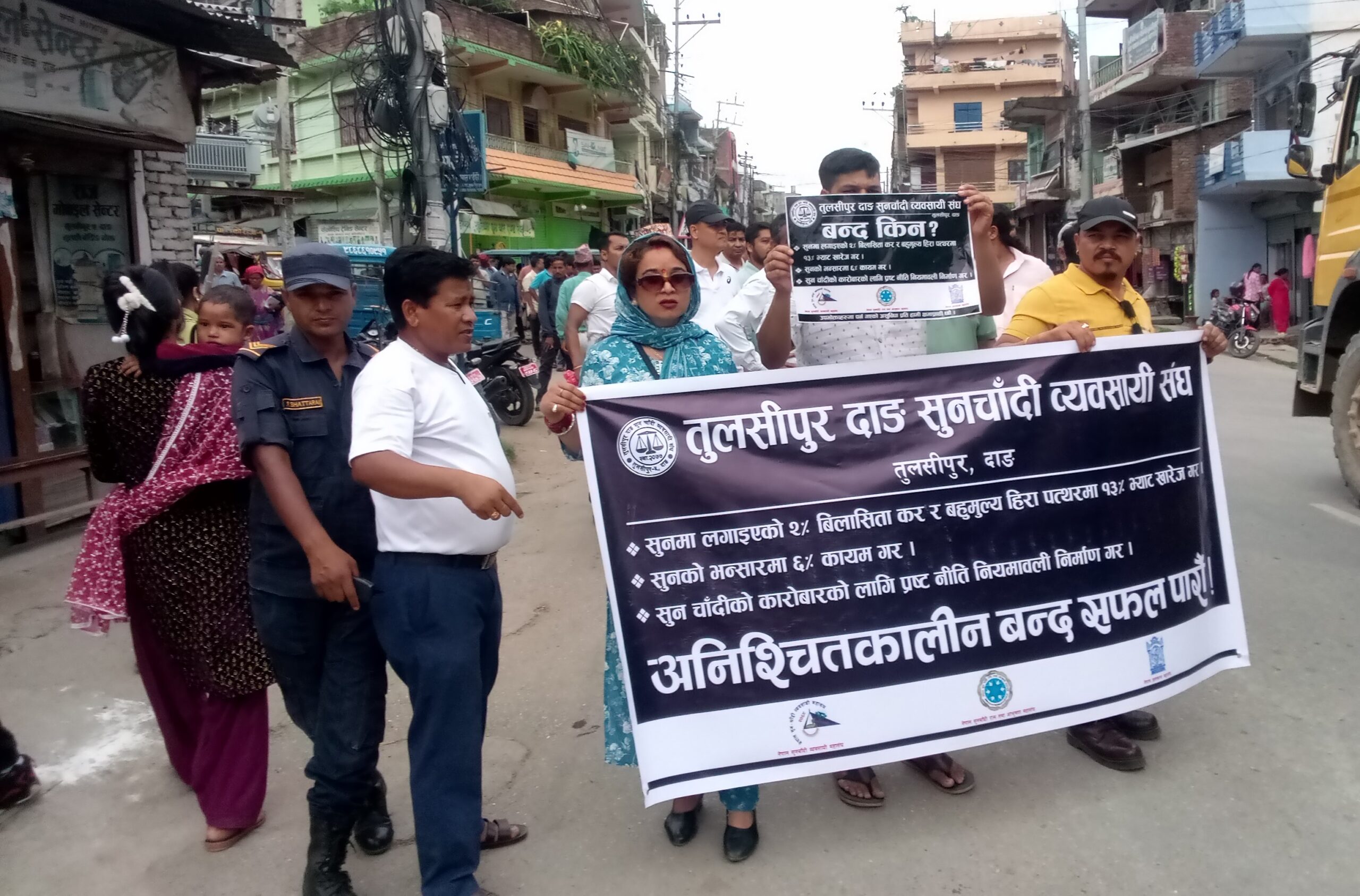 सोहि अनुरुप तुलसीपुरमा पनि विहानै देखी सुनचाँदी पसलहरु ठप्प पारी व्यवसायीहरु आन्दोलनमा उत्रिएका छन् । तुलसीपुर दाङ सुनचाँदी व्यवसाय संघ तुलसीपुरले विरोध कार्यक्रम अनुसार बजारमा ¥याली आयोजना गरेको थियो । तुलसीपुर ग लाईन स्थित संघको कार्यालय अगाडीबाट ¥याली सुरु गरी विरेन्द्रचोक ,सल्यानरोड,प्रादेशिक अस्पताल रोड,तुलसी बोर्डिङ चोक ,ङ लाईन हुदै विपिचोकमा पुगेर कोणसभामा परिणत भएको थियो ।