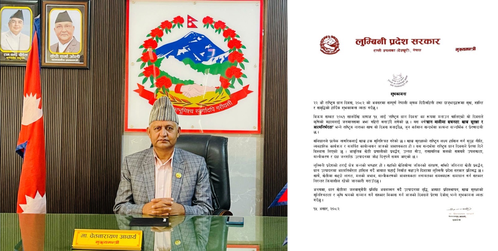 लुम्बिनी प्रदेशका मुख्यमन्त्री चेतनारायण आचार्यले २२ औं राष्ट्रिय धान दिवस, २०८२ को अवसरमा शुभकामना व्यक्त गर्नु भएको छ । २०६१ सालदेखि आषाढ १५ लाई राष्ट्रिय धान दिवसका रूपमा मनाउन थालिएको स्मरण गर्दै मुख्यमन्त्री आचार्यले यो दिवसले कृषिको महत्व जनमानसमा गहिरो बनाएको उल्लेख गर्नु भएको छ । ‘धान वालीमा सघनताः खाद्य सुरक्षा र आत्मनिर्भरता’ भन्ने राष्ट्रिय नारासहित मनाउन थालिएको यस वर्षको धान दिवस हालको सन्दर्भमा अत्यन्त सान्दर्भिक र प्रेरणादायी रहेको बताउनु भएको हो ।