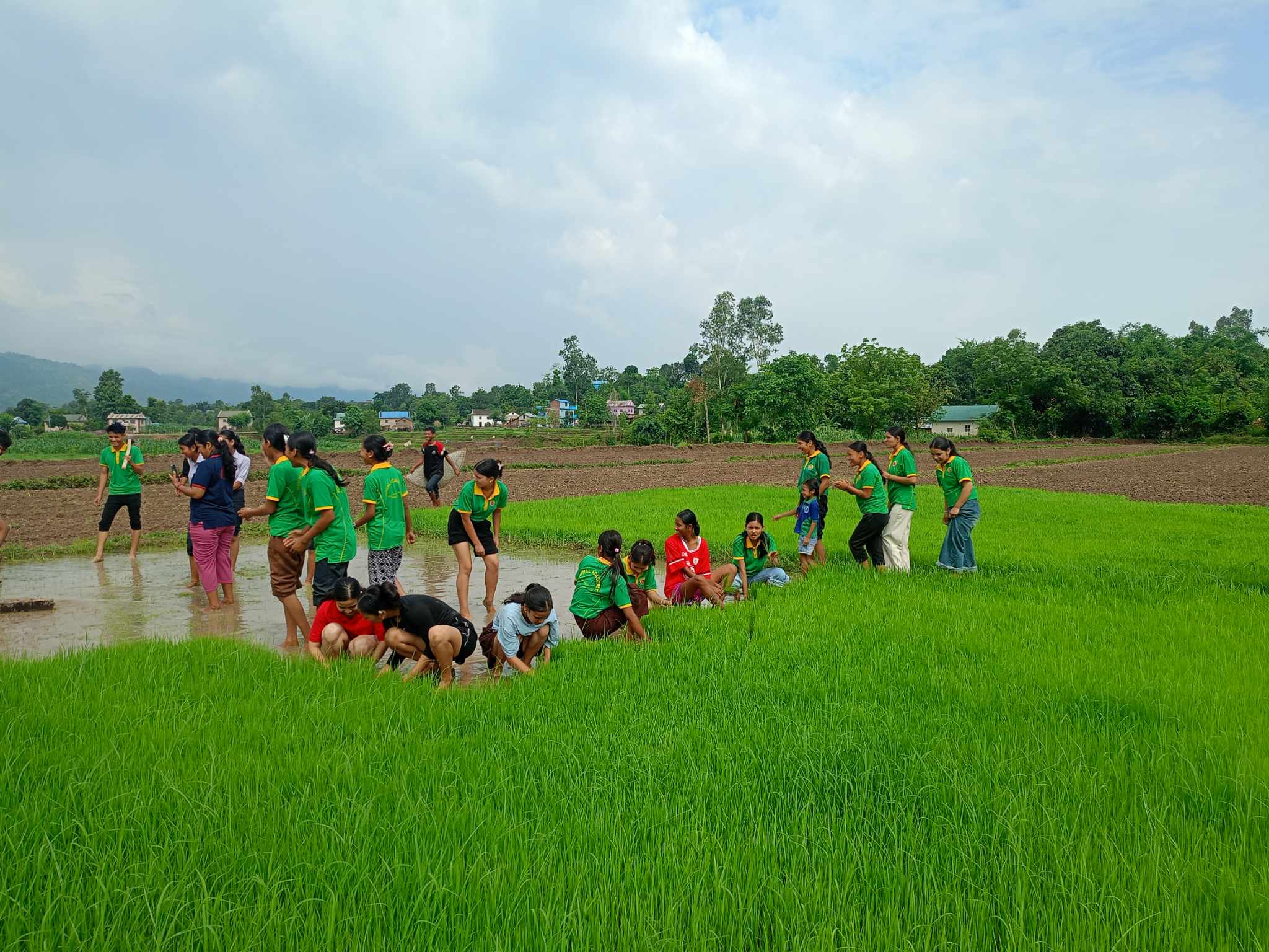 स्थानीय लक्ष्य बहादुर ओलीको खेतमा विद्यार्थीहरुले धान रोपेका हुन् ।