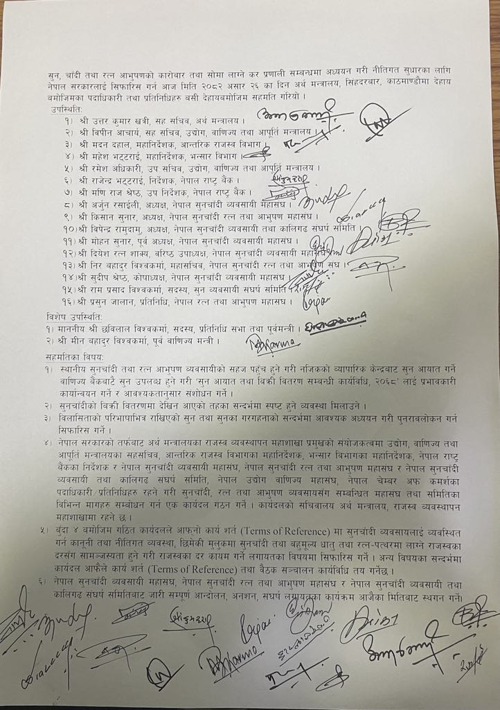 सुनचाँदी तथा रत्न आभुषणको कारोवार र सो मा लाग्ने कर प्रणालीको नितिगत सुधार गर्ने सन्र्दभमा भएको छलफलमा दुवै पक्ष बिच छ बुदे सहमती पत्रमा हस्ताक्षर भएको हो ।