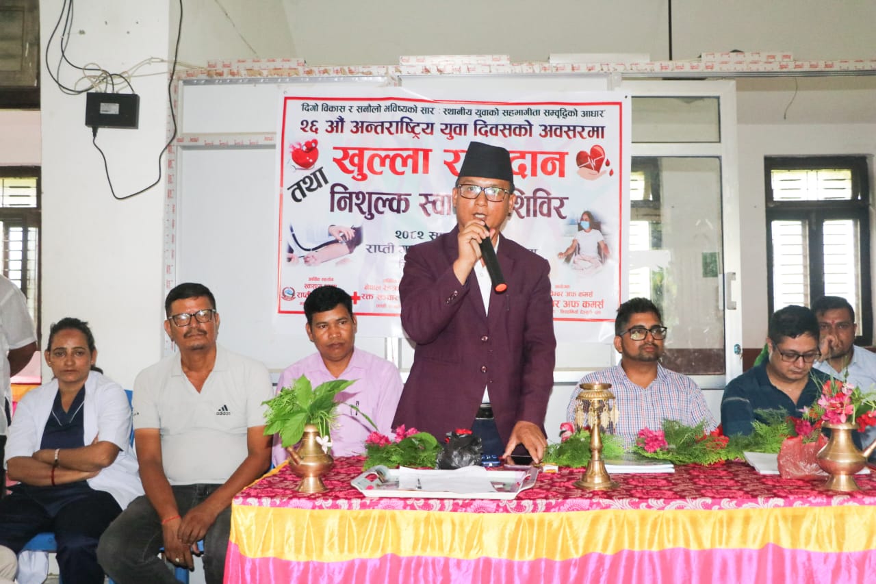 बुधबार राप्ती गाउँपालिका–५ सिसहनियाँमा आयोजित खुल्ला रक्तदान तथा निस्शुल्क विशेषज्ञ स्वास्थ्य शिविरको उद्घाटन कार्यक्रममा बोल्दै उहाँले, जिल्लाका विभिन्न अस्पतालमा रगतको अभाव भइरहेका बेला युवाहरूको पहल प्रशंसनीय र अनुकरणीय भएको बताउनुभयो। यस कार्यले रगत अभाव कम गर्न महत्त्वपूर्ण योगदान पुर्याउने विश्वास समेत उहाँले व्यक्त गर्नुभयो।