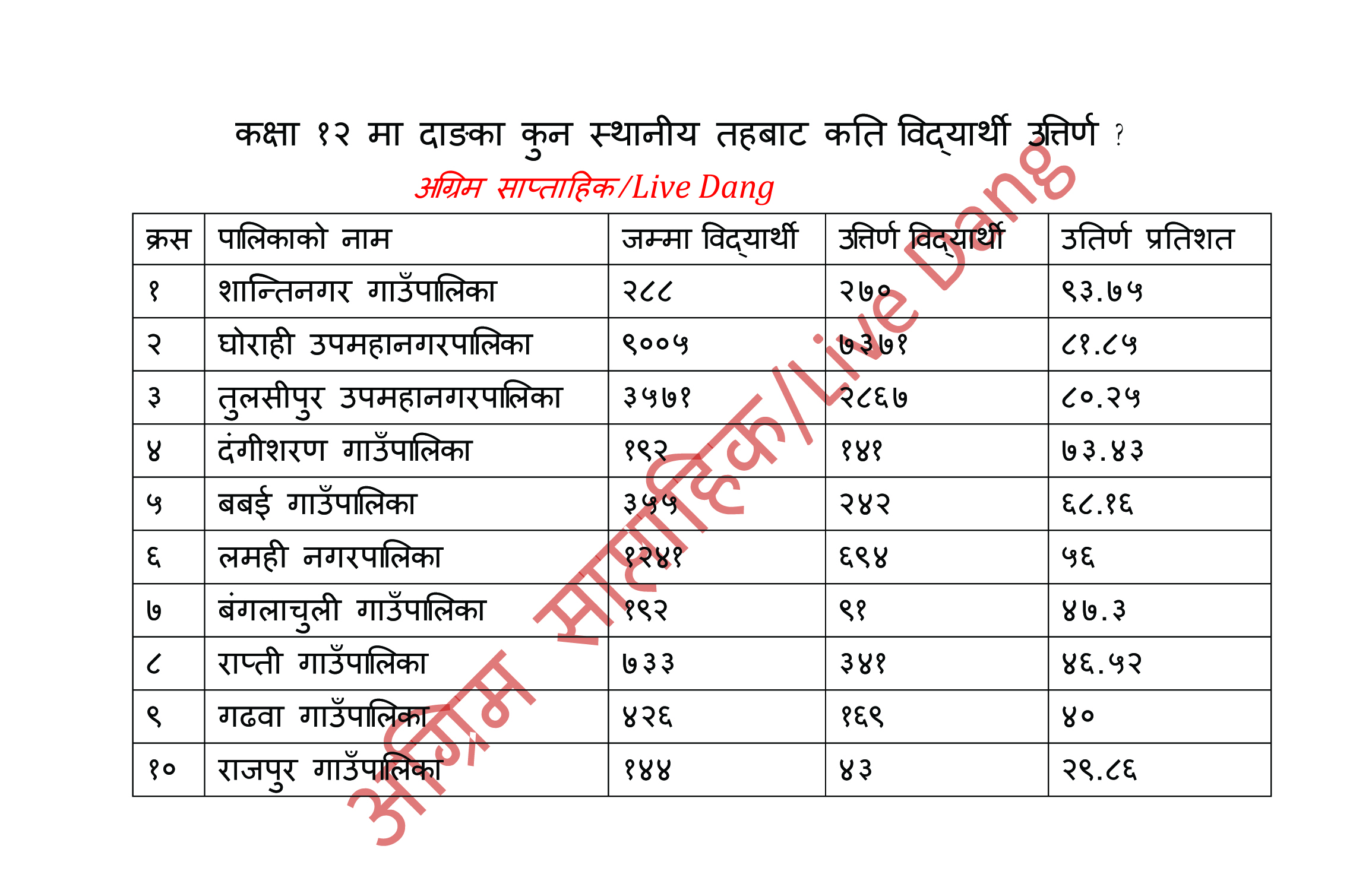 तुलसीपुर, २९ साउन। कक्षा १२ को परीक्षामा दाङको शान्तिनगर गाउँपालिका प्रथम भएको छ ।