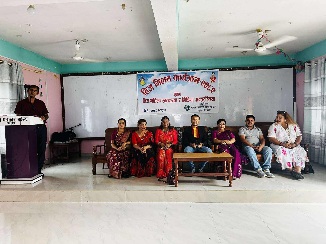 नेपाल पत्रकार महासङ्घ दाङ शाखा महिला विभागले बुधबार घोराहीमा तीज मिलन कार्यक्रम सम्पन्न गरेको छ । कार्यक्रममा सहभागी वक्ताहरूले तीजलाई संस्कृतिको संरक्षण, सामाजिक एकता र महिला सशक्तीकरणसँग जोड्दै अनावश्यक खर्चिलो प्रतिस्पर्धाबाट टाढा राख्नुपर्नेमा जोड दिएका छन् ।