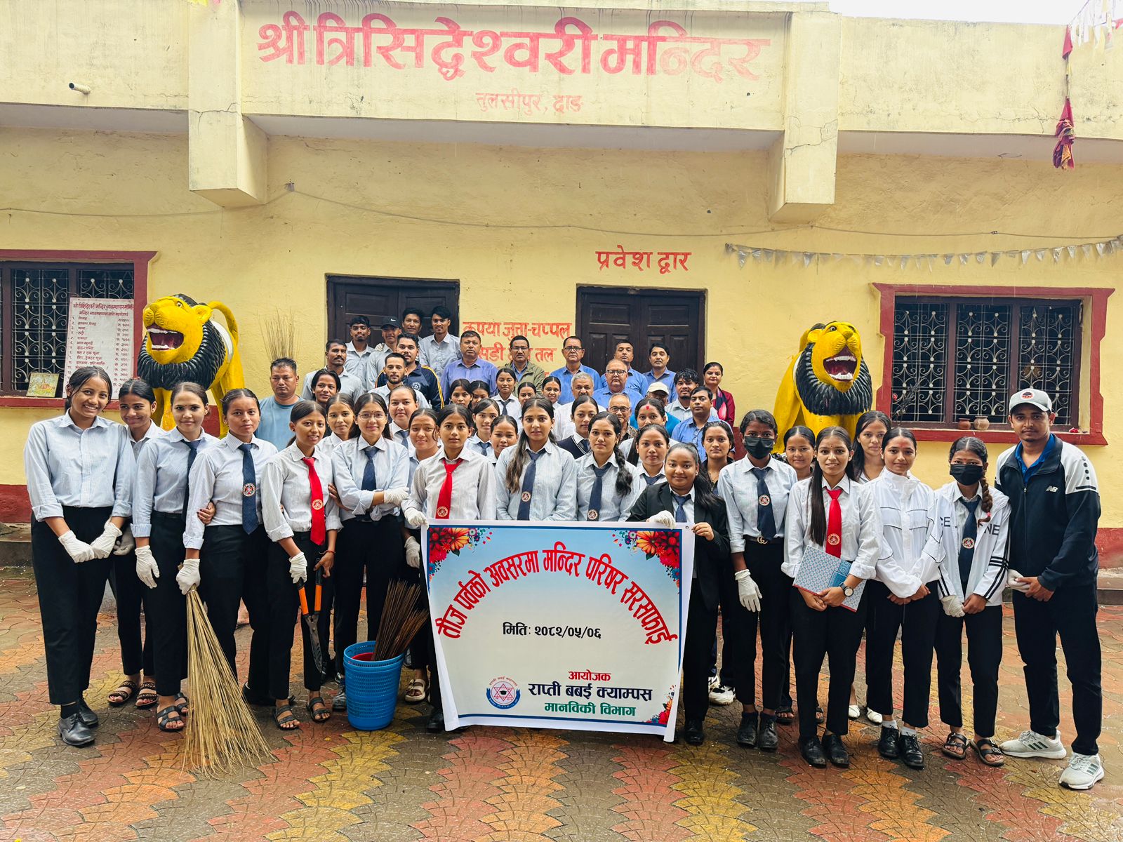 शुक्रबार विद्यार्थी, प्राध्यापक, कर्मचारीलगायतको टोलीले तुलसीपुर ६ स्थित त्रिसिद्देश्वरी कालिका मन्दिरमा सरसफाई गरिएको हो । तिजको अवसरमा सामाजिक कार्य गर्नुपर्ने भन्दै सरसफाई गरिएको हो ।