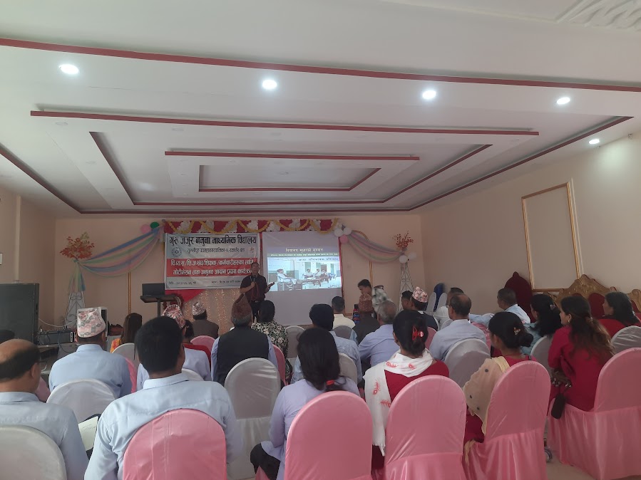 शिक्षकलाई प्रबिधिमैत्री बनाउने, नियमित तालिम दिने,नियमित मूल्यांकन गर्ने जस्ता कार्य गर्ने, शिक्षकहरु पनि एक जुट हुने जस्ता कार्य भएमा शिक्षण कार्य उत्कृष्ट हुने उनले बताए । विद्यालय ब्यबस्थापन समितिका अध्यक्ष कृष्ण खड्काको अध्यक्षतामा भएको कार्यक्रममा शिक्षक उद्देश्यमाथि सहायक प्रधानाध्यापक प्रमोद कुमार न्यौपानेले प्रष्ट पारेका थिए, भने प्रधानाध्यापक विष्णु कुमारी केसीले स्वागत मन्तब्य ब्यक्त गरेकी थिइन ।