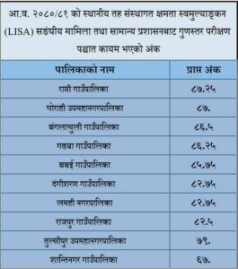 आठौं स्थानमा राजपुर गाउँपालिका ८२.५० प्रतिशत, नवौं स्थानमा तुलसीपुर उपमहानगरपालिका ७९ प्रतिशत र दशौं स्थानमा शान्तिनगर गाउँपालिका ६७ प्रतिशत अंकसहित परेका छन्।