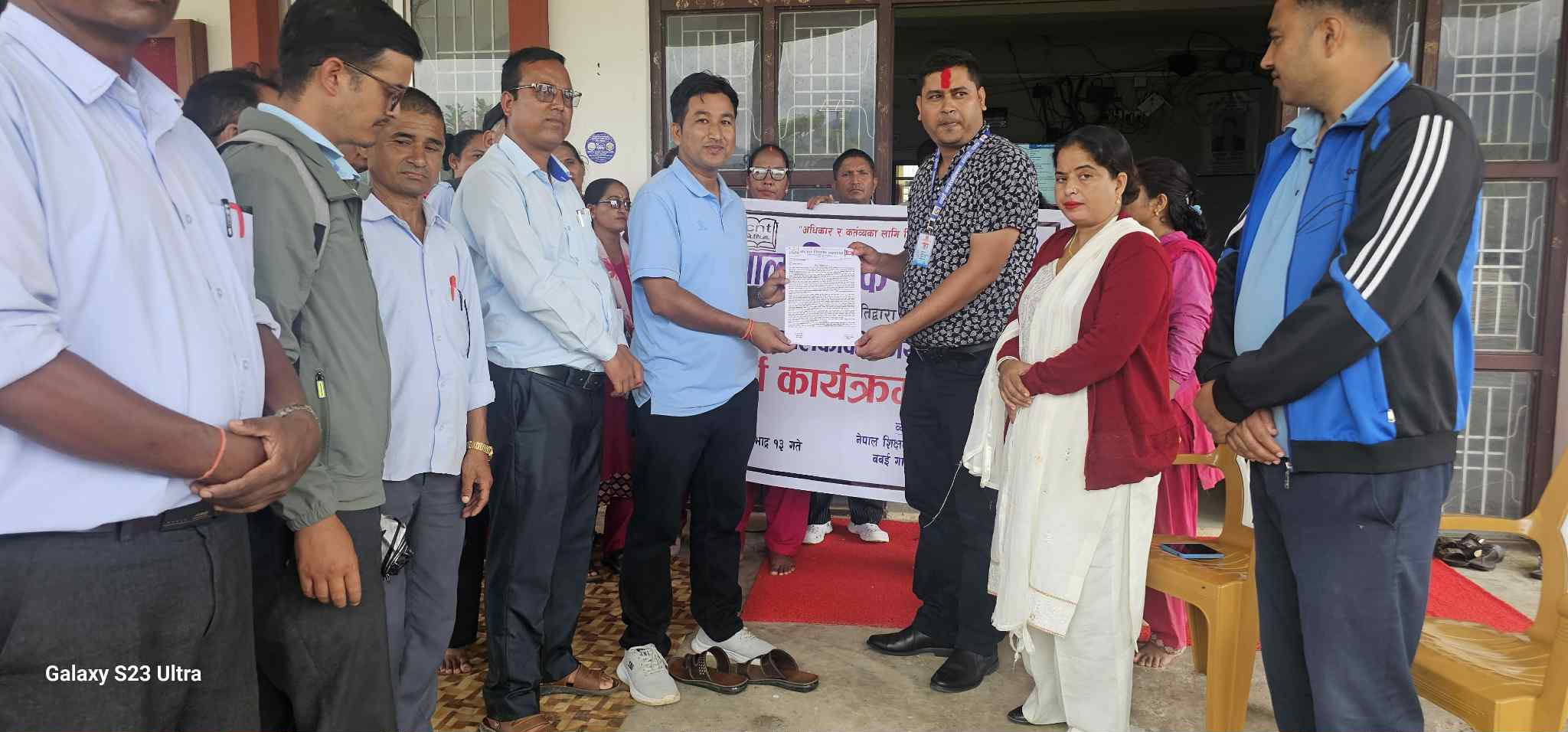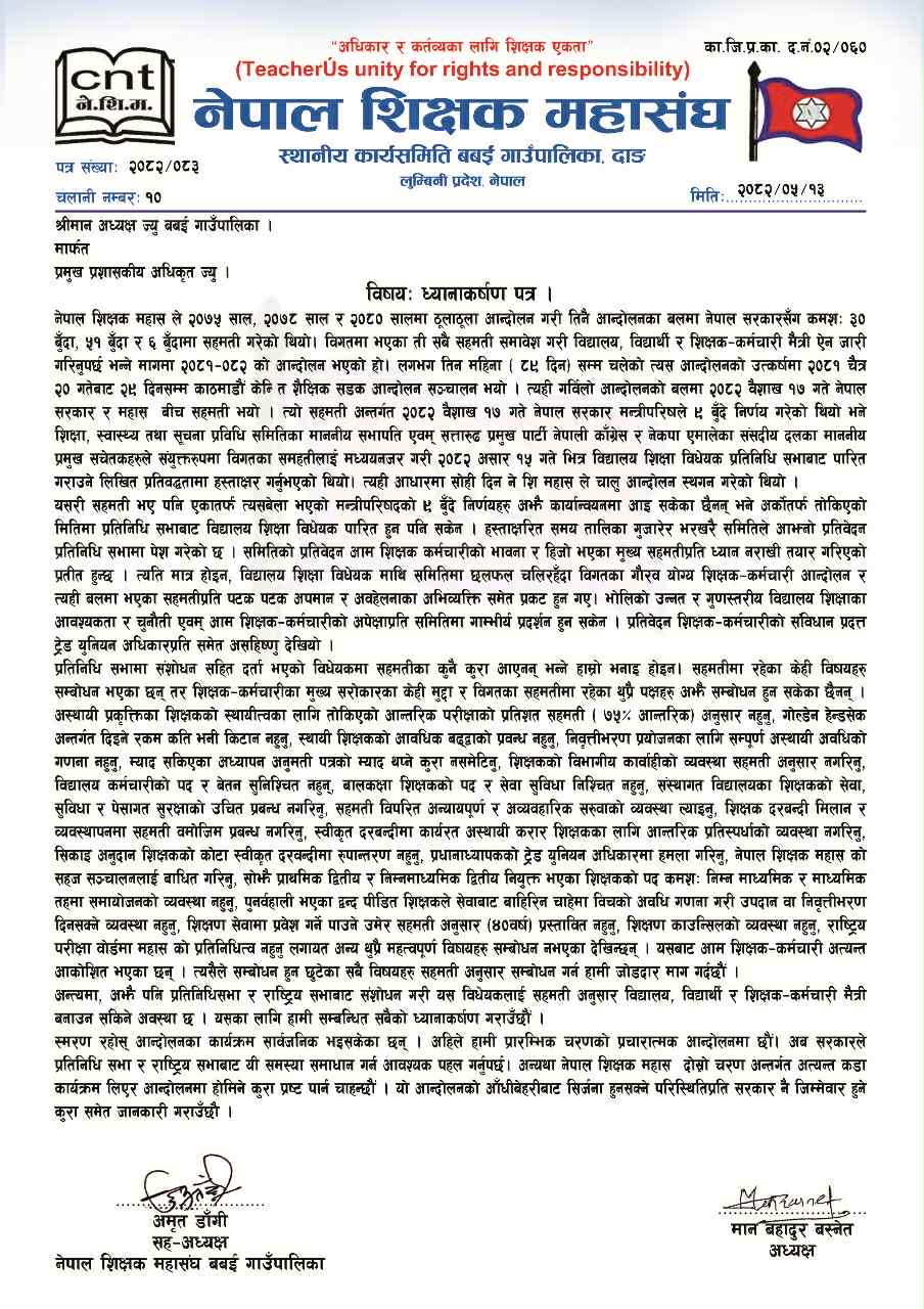 तुलसीपुर, १३ भदौ । नेपाल शिक्षक महासंघ राष्ट्रिय समितिको निर्णयअनुसार दाङको बबई गाउँपालिकामा पनि शुक्रबार धर्ना संगै ध्यानाकर्षण पत्र बुझाइएको छ ।