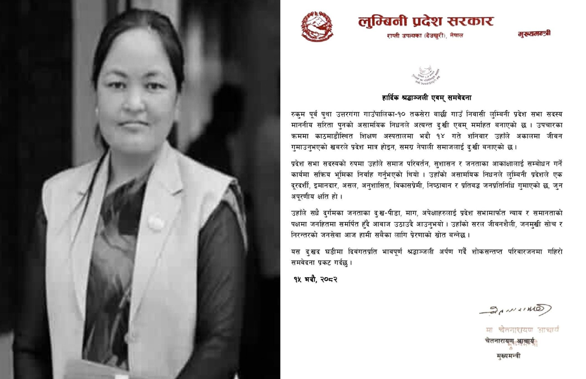 लुम्बिनी प्रदेश सभा सदस्य सरिता पुनको असामयिक निधनप्रति प्रदेशका मुख्यमन्त्री चेतनारायण आचार्यले गहिरो दुःख व्यक्त गर्नुभएको छ ।