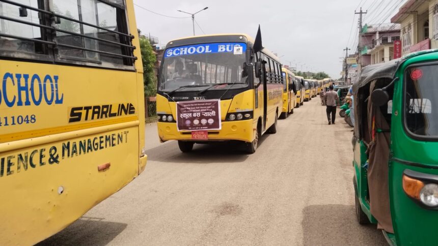 विद्यालय शिक्षा विधेयक सच्याउन माग गर्दै निजी विद्यालय सञ्चालकहरूले शनिबार दाङको तुलसीपुर बजार क्षेत्रमा स्कुल बससहित र्याली निकालेका छन् ।