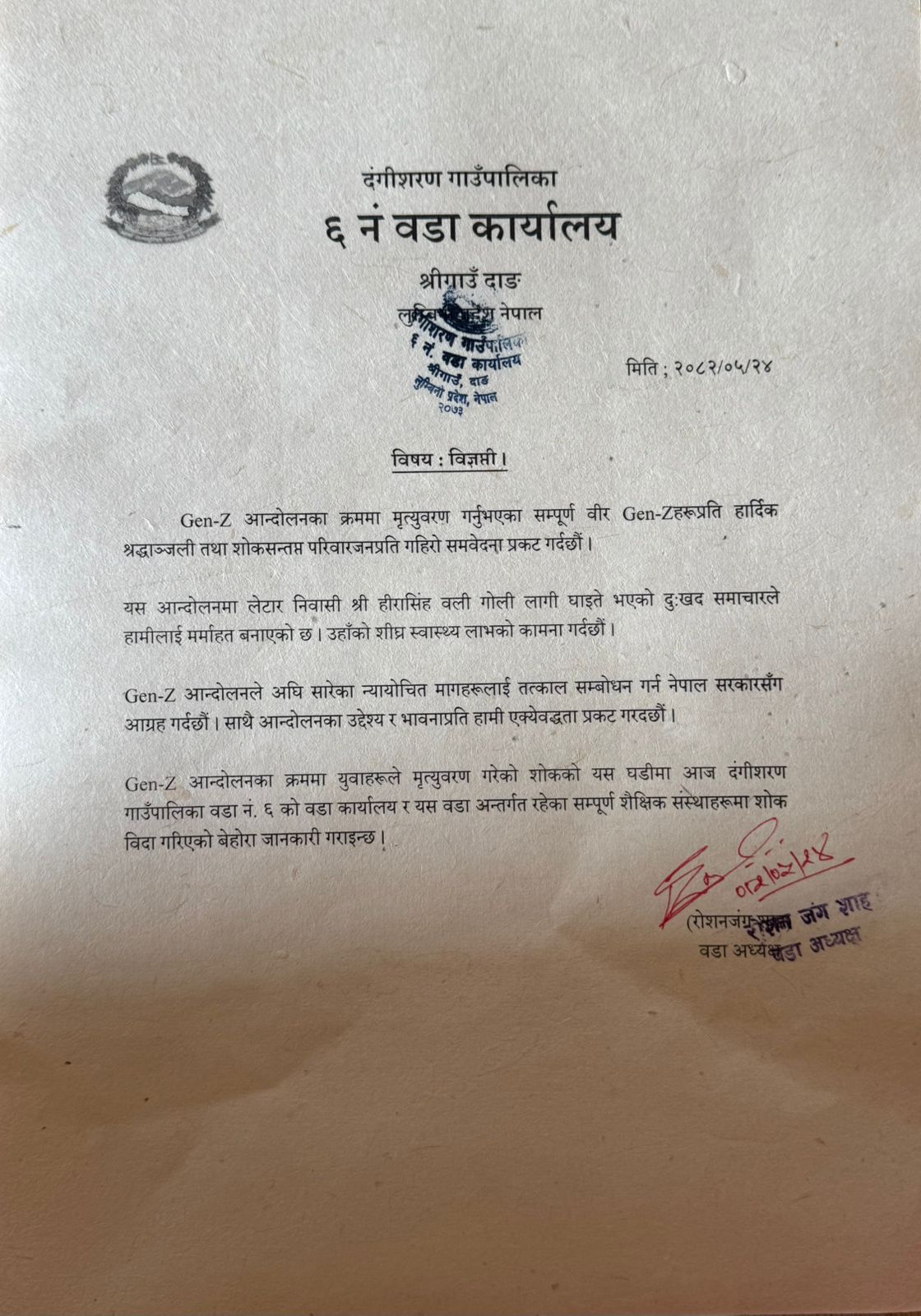 साथै आन्दोलनका क्रममा मृत्यु भएकाहरु १७ जना विद्यार्थीप्रति श्रद्धान्जली ब्यक्त गर्दै मंगलबार वडा कार्यालय र शैक्षिक संस्था बन्द गरिएको छ ।