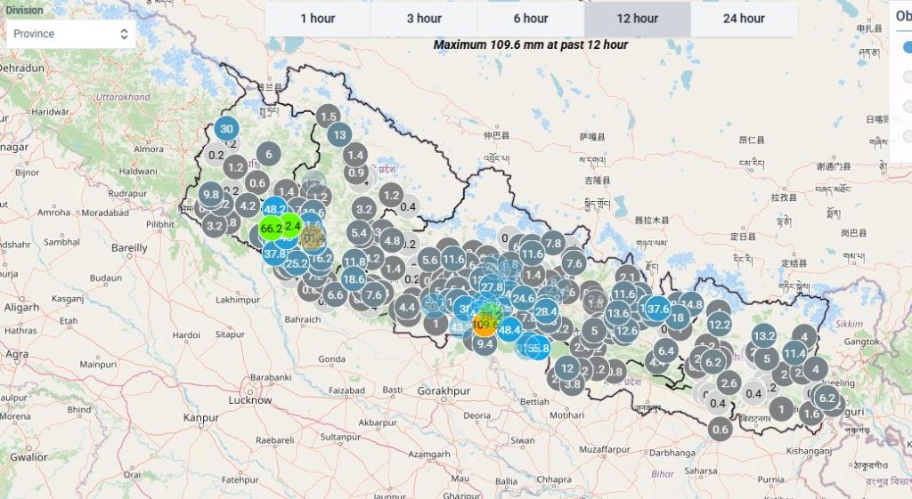जल तथा मौसम विज्ञान विभागका अनुसार विगत १२ घण्टाको अवधिमा देउराली नवल केन्द्रमा १०९.६ मिलिमिटर वर्षा भएको छ । यसैगरी सुर्खेतको गोठीकाँडा केन्द्रमा १०१.४ मिलिमिटर वर्षा मापन भएको छ । सुर्खेतकै जम्मुमा ६२.४ मिलिमिटर वर्षा भएको छ ।