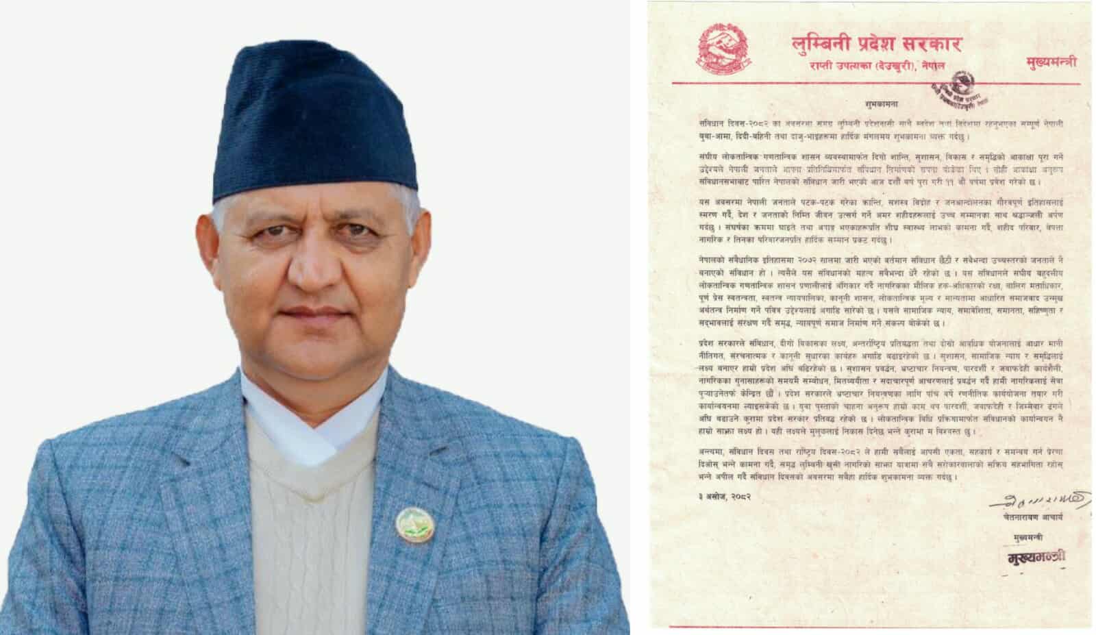 लुम्बिनी प्रदेशका मुख्यमन्त्री चेतनारायण आचार्यले लोकतान्त्रिक विधि प्रक्रियामार्फत संविधान कार्यान्वयनबाटै मुलुकले निकास पाउने बताउनुभएको छ । संविधान दिवस–२०८२ का अवसरमा शुक्रबार शुभकामना सन्देश जारी गर्दै उहाँले संविधान कार्यान्वयनमार्फत सुशासन, सामाजिक न्याय र समृद्धिको यात्रामा सबै एकजुट भएर अघि बढ्नुपर्ने आवश्यकता औंल्याउनुभएको हो ।