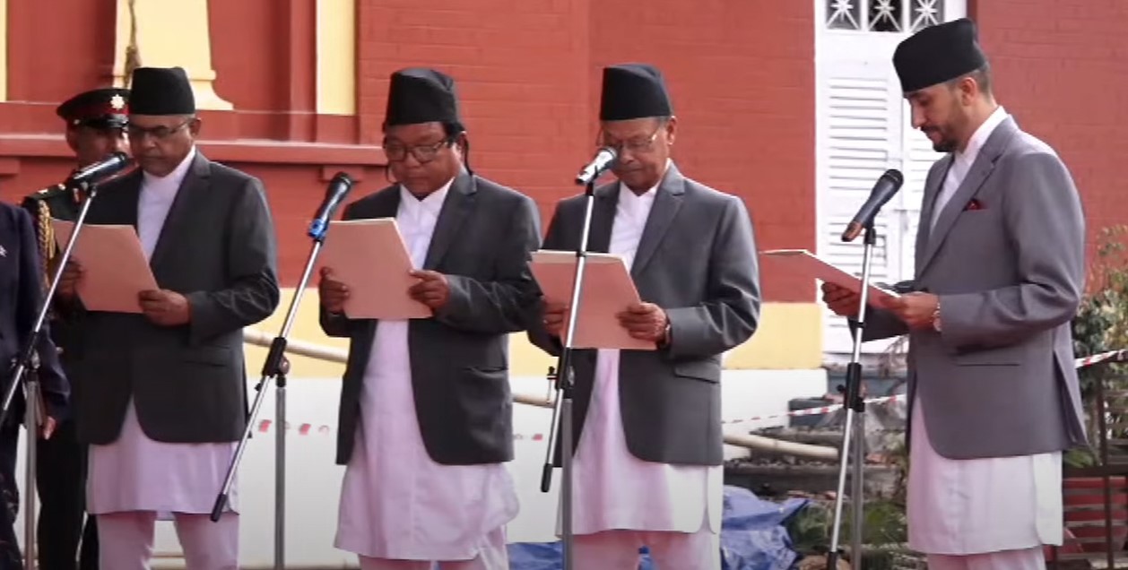 नवनियुक्त मन्त्रीहरूले सोमबार शीतल निवासमा आयोजित समारोहमा राष्ट्रपति रामचन्द्र पौडेलसमक्ष पद तथा गोपनीयताको शपथ ग्रहण गरेका छन्। प्रधानमन्त्री कार्कीले आइतबार अनिलकुमार सिन्हालाई उद्योग वाणिज्य, आपूर्ति, कानुन,न्याय तथा संसदीय मन्त्रालय र भूमिसुधार मन्त्रालय, सहकारी तथा गरिबी निवारण, महावीर पुनलाई शिक्षा विज्ञान तथा प्रविधि ,मदन परियारलाई कृषि, जगदीश खरेललाई सञ्चार तथा सूचना प्रविधि मन्त्री र संगीता कौशल मिश्रालाई स्वास्थ्य मन्त्रीमा सिफारिस गरेकी थिइन्।