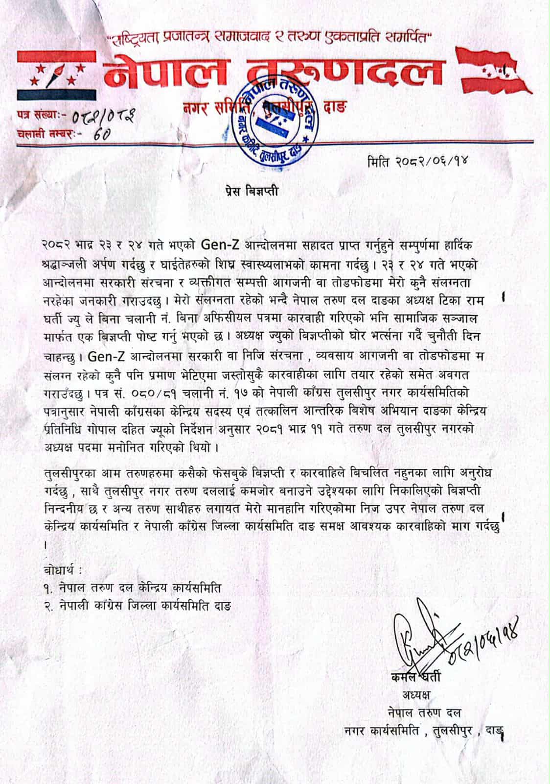 चलानी नम्बर र पत्र संख्याबिनाको पत्र सार्वजनिक गरिएको भन्दै यस्तो कार्य गलत भएको भन्दै भ्रत्सना समेत गरेका छन् । आफू तरून दलको तुलसीपुरको आधिकारिक अध्यक्ष भएको समेत घर्तीले बताएका छन् । उनले बिज्ञप्ति जारी गरि यस्तो जानकारी दिएका हुन् ।