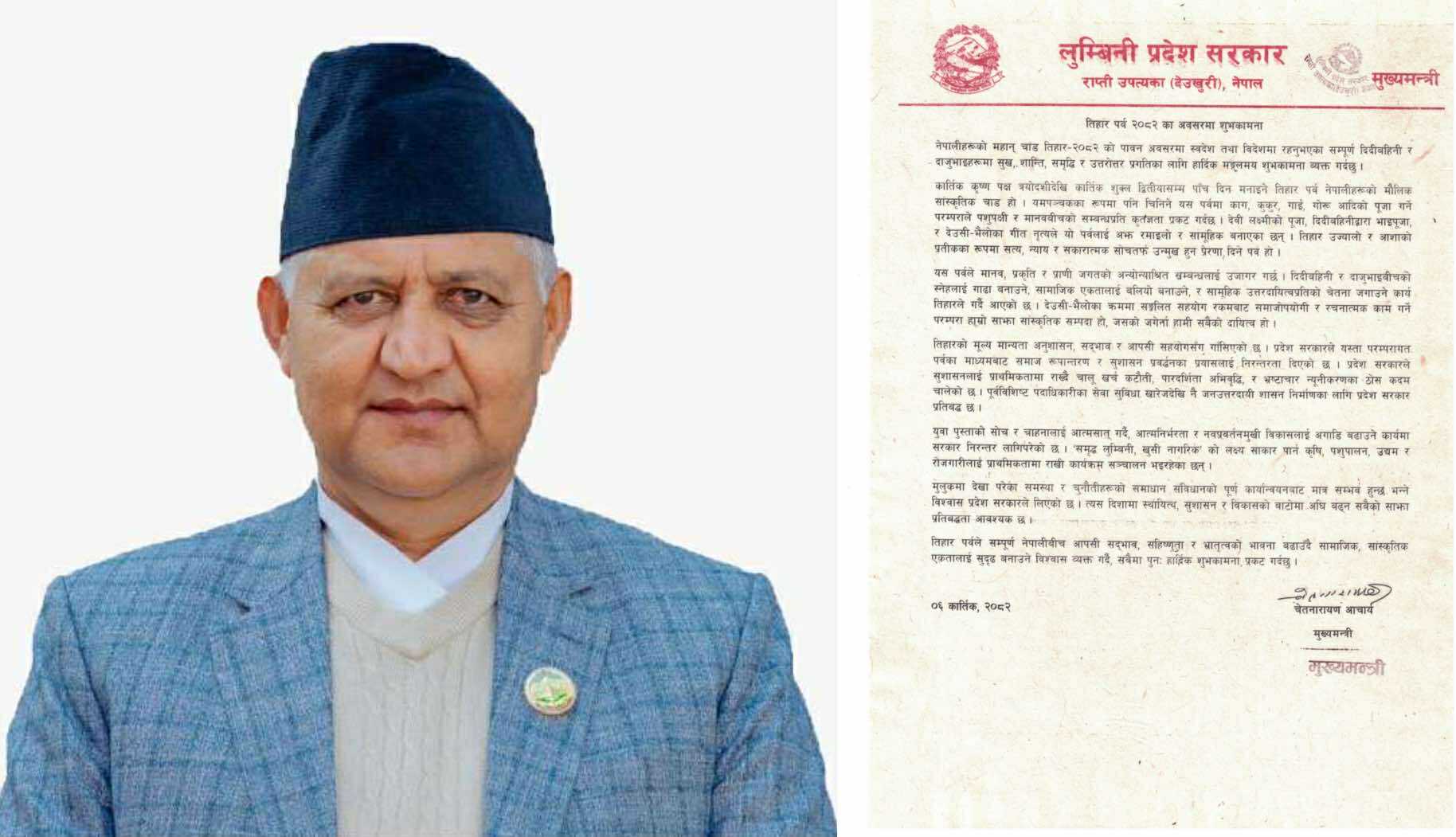 दाङ, ६ कात्तिक । लुम्बिनी प्रदेशका मुख्यमन्त्री चेतनारायण आचार्यले तिहार पर्वले सामाजिक एकता, सद्भाव र भ्रातृत्वको भावना बलियो बनाउन सहयोग गर्ने विश्वास व्यक्त गर्नुभएको छ । तिहार–२०८२ का अवसरमा जारी शुभकामना सन्देशमा उहाँले सत्य, न्याय र सकारात्मक सोचतर्फ समाजलाई उन्मुख गराउने तिहारको मूल्य र सन्देशलाई आत्मसात् गर्न सबैलाई आग्रह गर्नुभएको छ ।