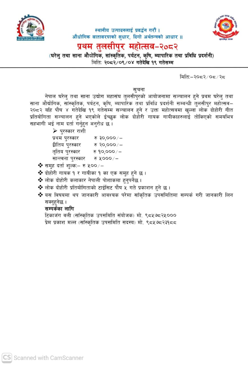 तुलसीपुर, २ पुस । स्थानीय उत्पादनलाई प्रवर्द्धन गर्ने उद्देश्यका साथ आयोजना हुन लागेको प्रथम तुलसीपुर महोत्सव–२०८२ मा खुला लोकदोहोरी गीत प्रतियोगिता सञ्चालन हुने भएको छ।