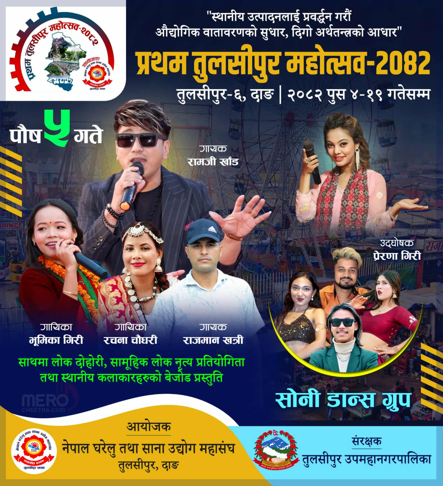 महोत्सवमा आज चर्चित गायिका भुमिका गिरी, गायिका रचना चौधरी , गायक राजमान खत्री, र सोनी डान्स ग्रुप लगायत स्थानीय कलाकारहरुकोे प्रस्तुती रहने भएको छ । महोत्सव पुष १९ गतेसम्म संचालन हुने छ ।