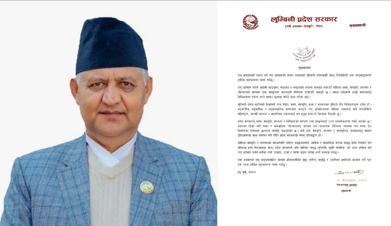 शुभकामना सन्देशमा मुख्यमन्त्री आचार्यले लुम्बिनी प्रदेश भूगोलको हिसाबले मात्र नभई भाषा, संस्कृति, कला र सभ्यताका दृष्टिले पनि विविधतायुक्त प्रदेश भएको उल्लेख गरेका छन् ।