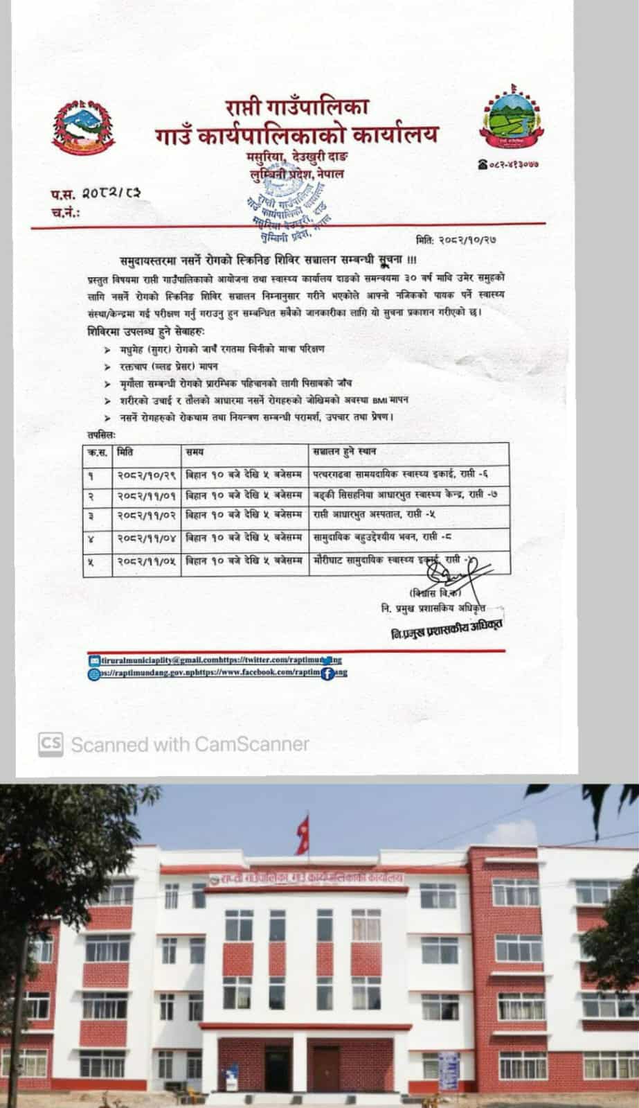 राप्ती गाउँपालिकाको आयोजनामा तथा स्वास्थ्य कार्यालय दाङको समन्वयमा ३० वर्षभन्दा माथिका नागरिकलाई लक्षित गरी उक्त शिविर सञ्चालन गर्न लागिएको हो। समुदायस्तरमै नसर्ने रोगको समयमै पहिचान गरी उपचार तथा नियन्त्रणमा सहयोग पुर्याउने उद्देश्यले गाउँपालिकाका विभिन्न वडामा शिविर सञ्चालन गरि लागेको हो।